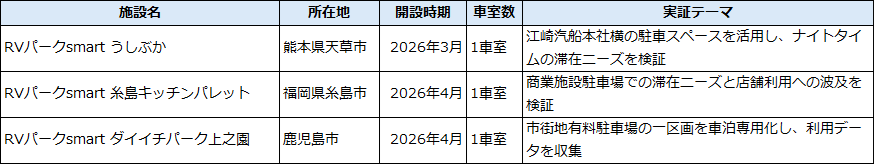今回オープンしたのは、3月開設の「RVパークsmart うしぶか」、4月開設の「RVパークsmart 糸島キッチンパレット」、「RVパークsmart ダイイチパーク上之園」の3施設です。いずれもまずは1車室から導入し、地域における車泊ニーズや施設利用への波及効果を検証するスモールスタート型の取り組みです。今後の利用状況や利用者データを踏まえ、車室数の増設や運用改善を検討してまいります。