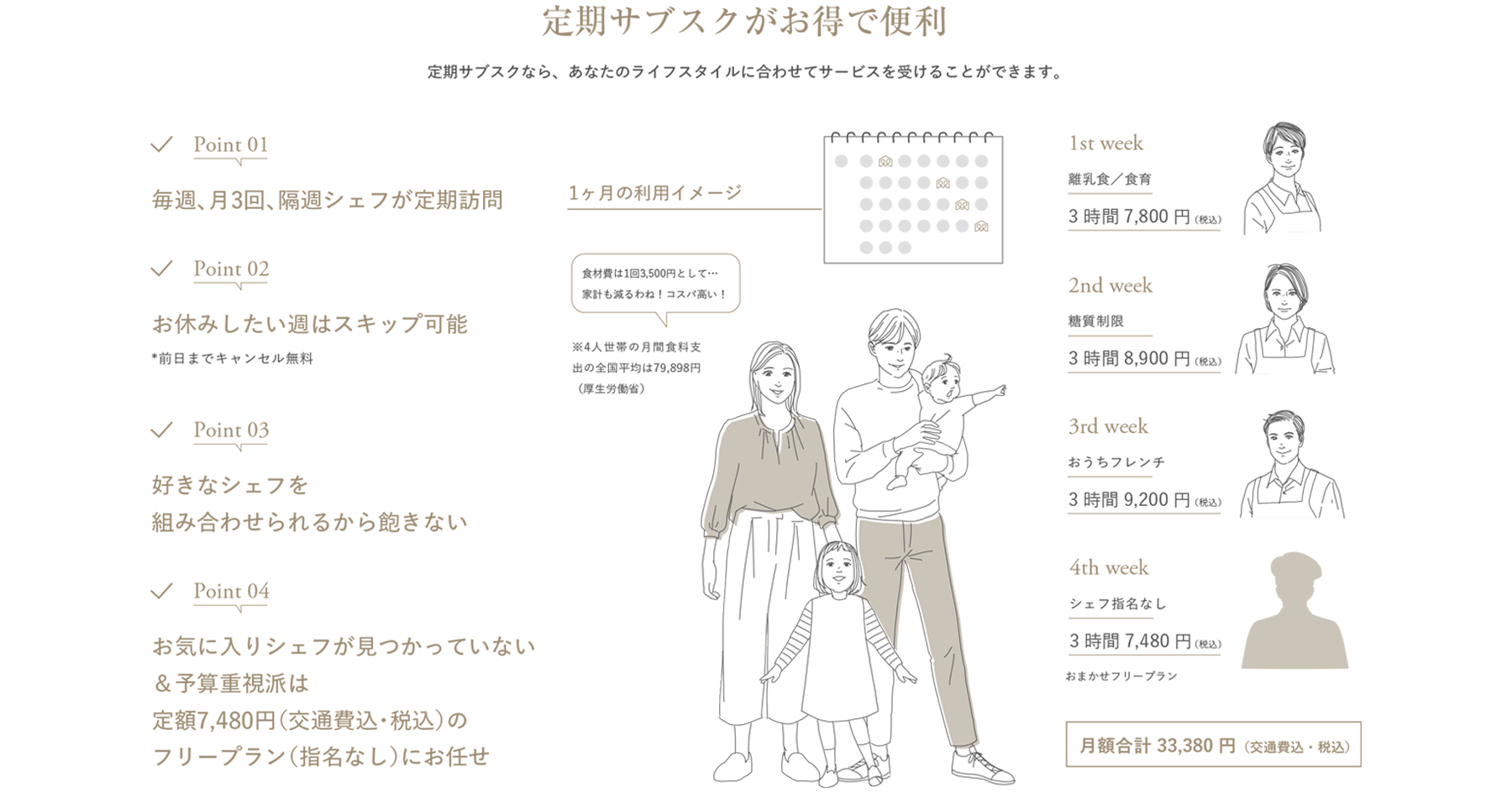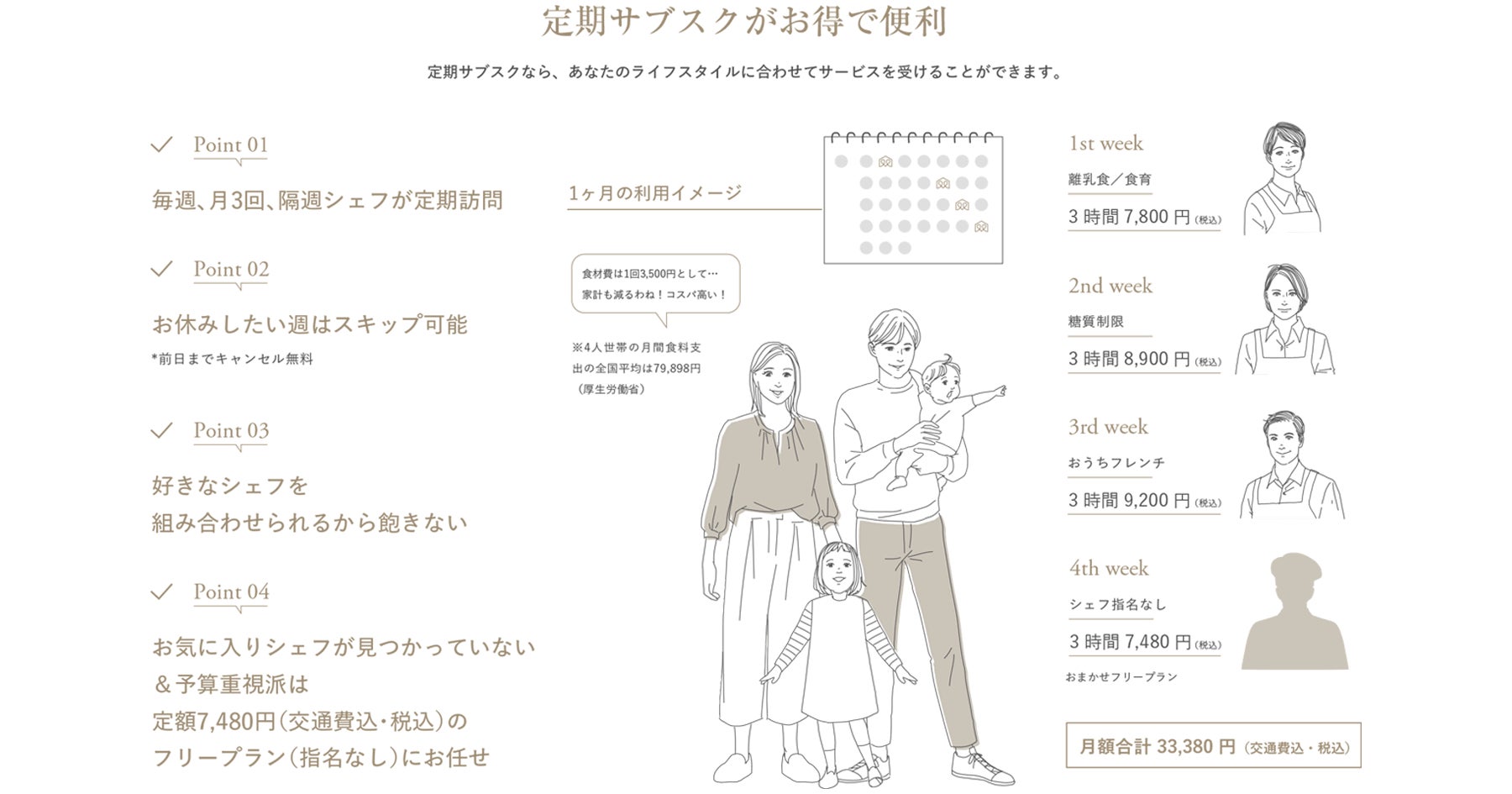 栄養士・調理師などの資格を持った食の専門家が、出張シェフとして約1,800名登録する日本最大級の出張シェフサービス。産前産後のお食事、離乳食から筋トレ・ボディメイク、生活習慣病対策のお食事までライフステージに合わせて、家庭における料理をパーソナライズ。行事食やパーティコース料理など特別な日のお料理にも対応しています。 1回1時間〜献立の提案、食材の買い出しから、12品前後のお料理をお作りします。