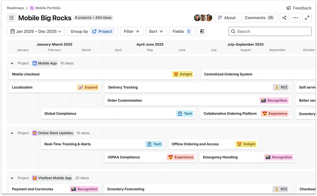 アイデアに優先順位を付けたら、ロードマップを作成し関係者と共有してフィードバックをもらいます。組織外の関係者であっても個別の関係者に合わせたロードマップを作成し共有できます。また、コメント、投票、または簡単な応答を通じてフィードバックを提供してもらうことができます。