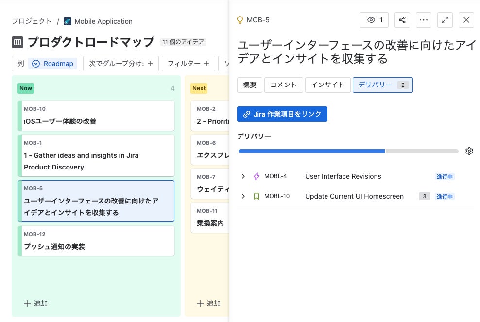 Jira Product Discoveryで定義したアイデアは、Jiraのプロジェクトやタスクとシームレスに結び付けることができます。これによってチームはディスカバリーからデリバリーまでコンテキストと可視性を完全に確保できます。