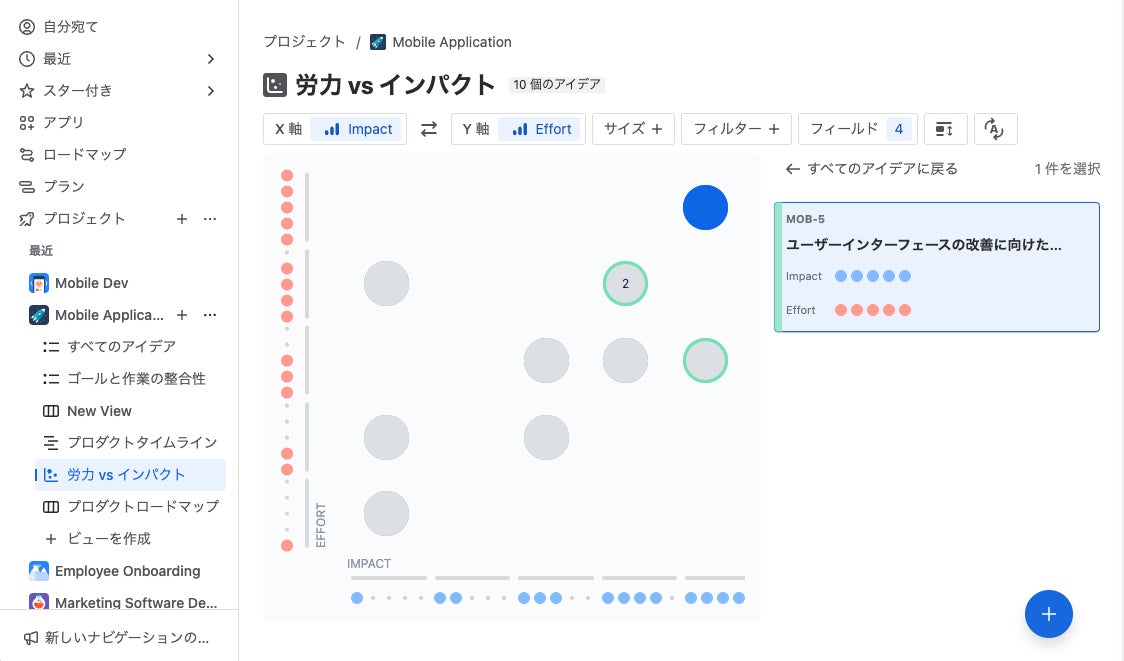 プロダクトの開発を始める前に、プロダクトに実装すべきすべてのアイデア、ユーザーからのフィードバックや市場調査結果などのインサイトをすべて1か所に集めて整理することができます。次に、今すぐ対応すべきアイデアと後から対応する、またはまったく対応しないアイデアを決めて、優先順位を付けます。