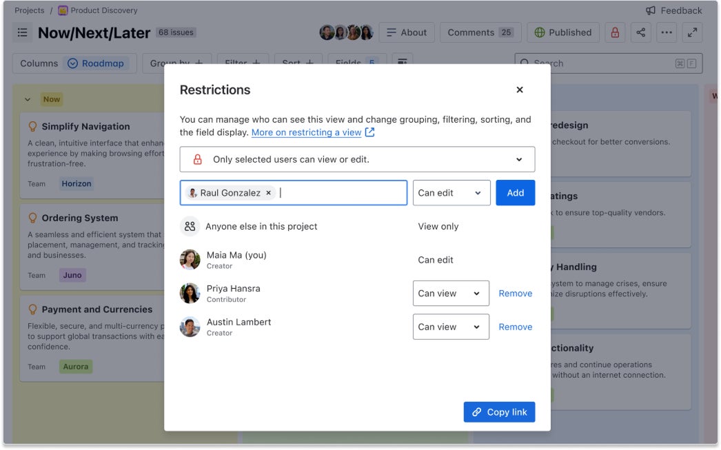 会話の内容を集中させ、利害関係者に必要な情報のみを必要なタイミングで閲覧できるように、詳細な閲覧権限設定を行えます。さらに、リリース トラックとサンドボックス、プロジェクトのコピー、24 時間 365 日のサポート、より高いストレージと自動化制限など、Jira Product Discovery を大規模に管理するための統一された管理体験をご利用いただけます。