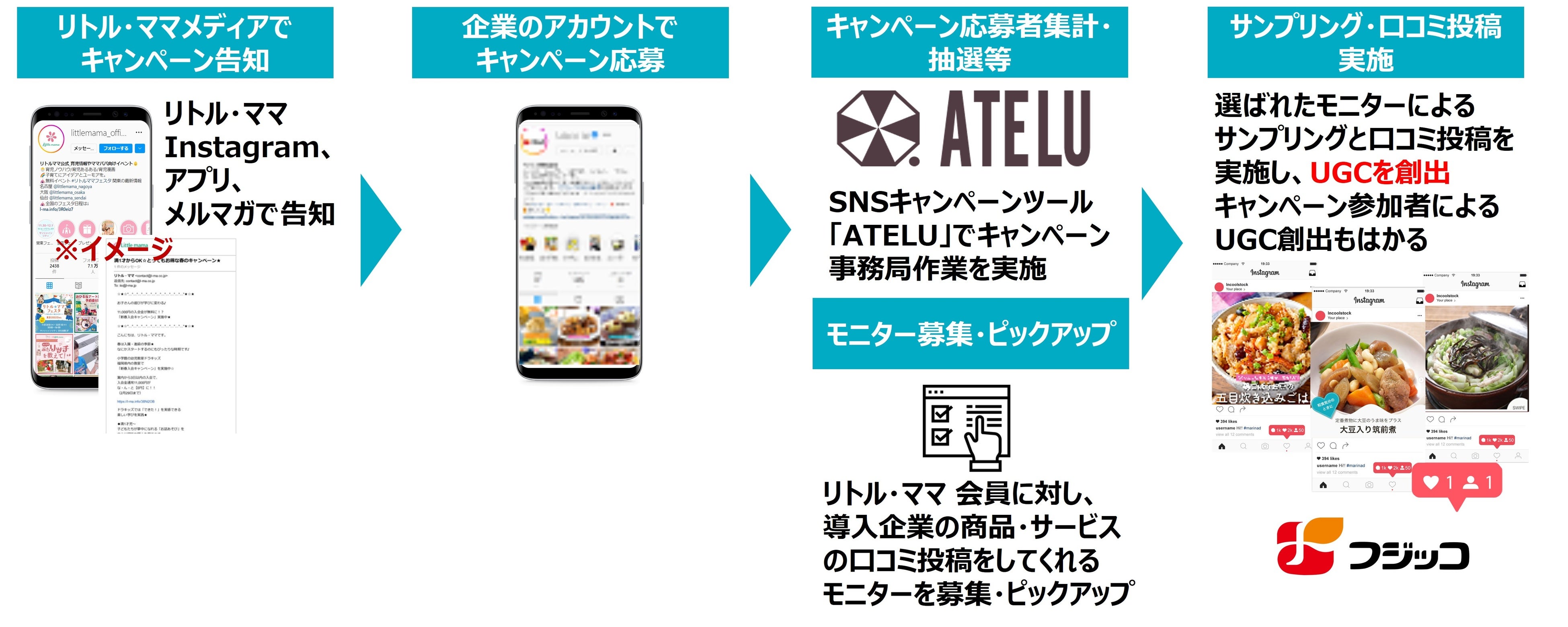 ◆「リトル・ママ」の会員に対して商品のモニター・サンプリングを募り、モニターのSNSで導入企業の商品の口コミ投稿を行いUGC(※2)を創出。同時に、キャンペーン参加者によるUGC創出もはかる。