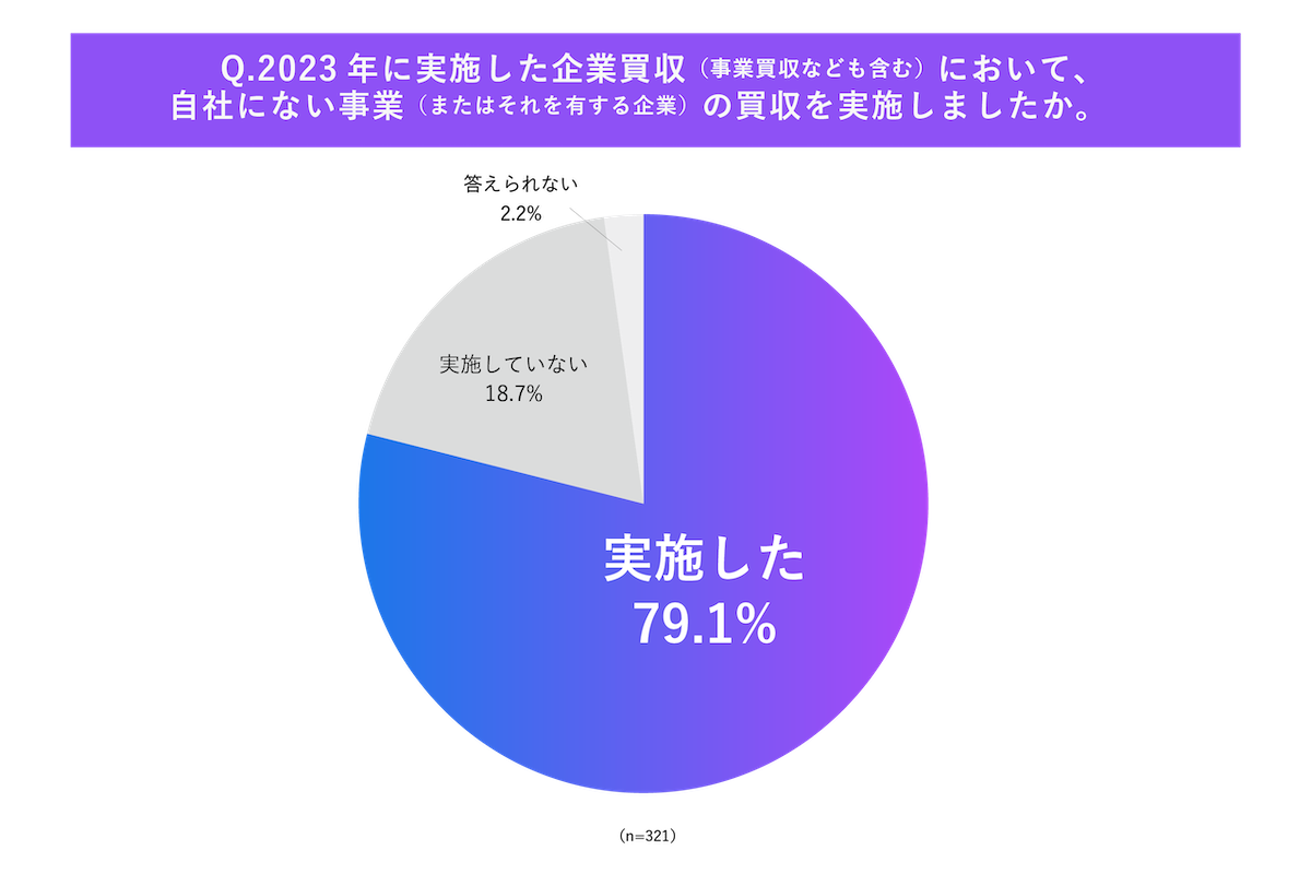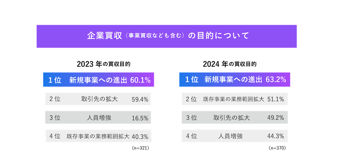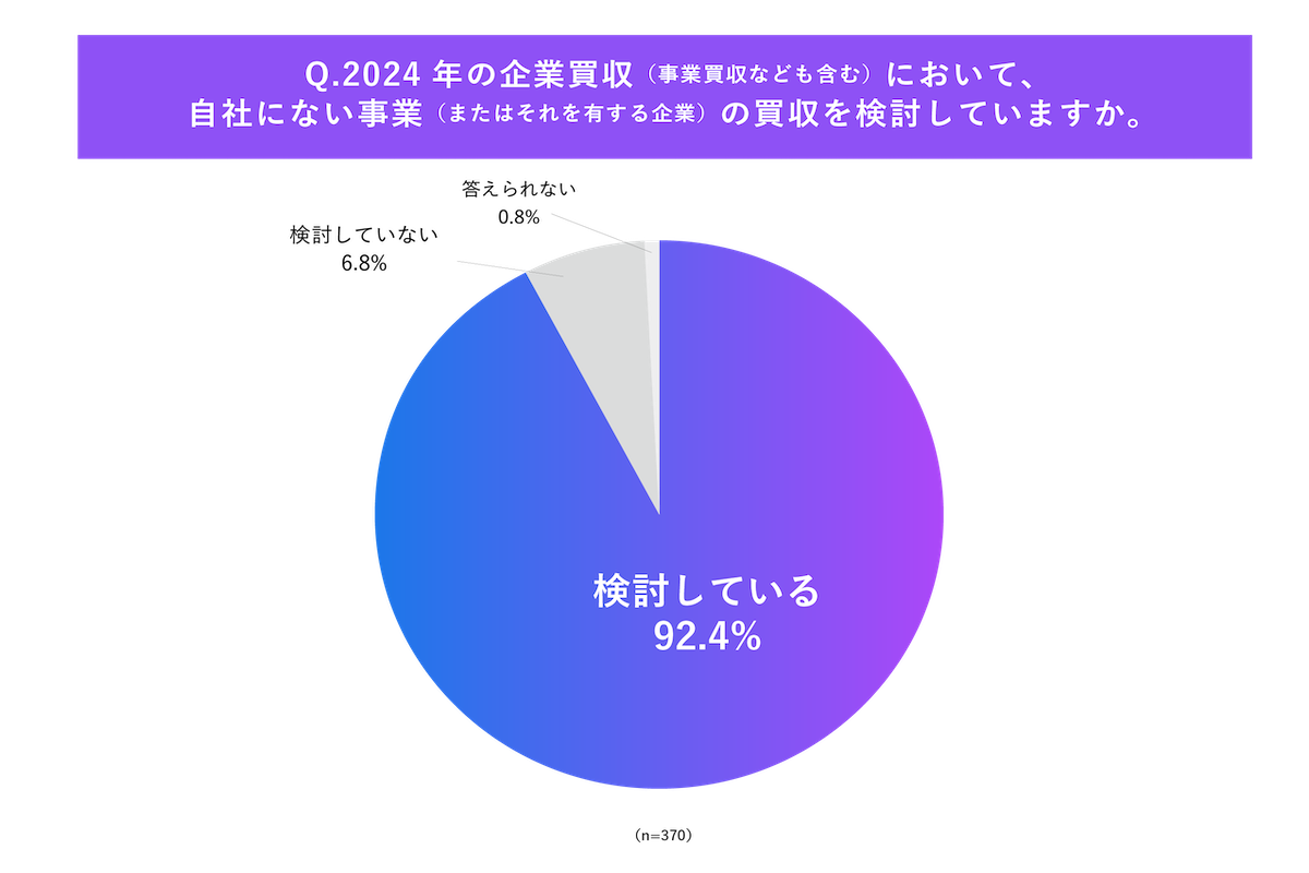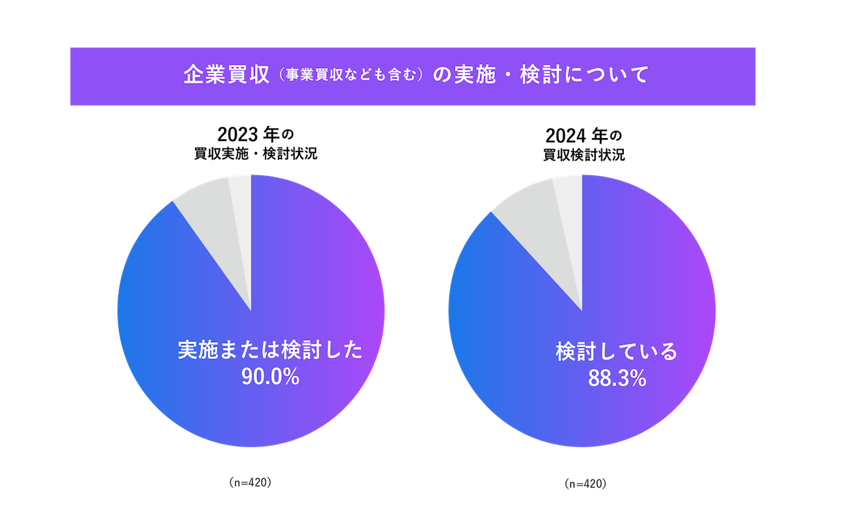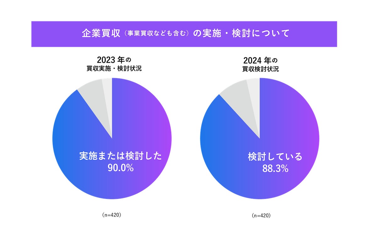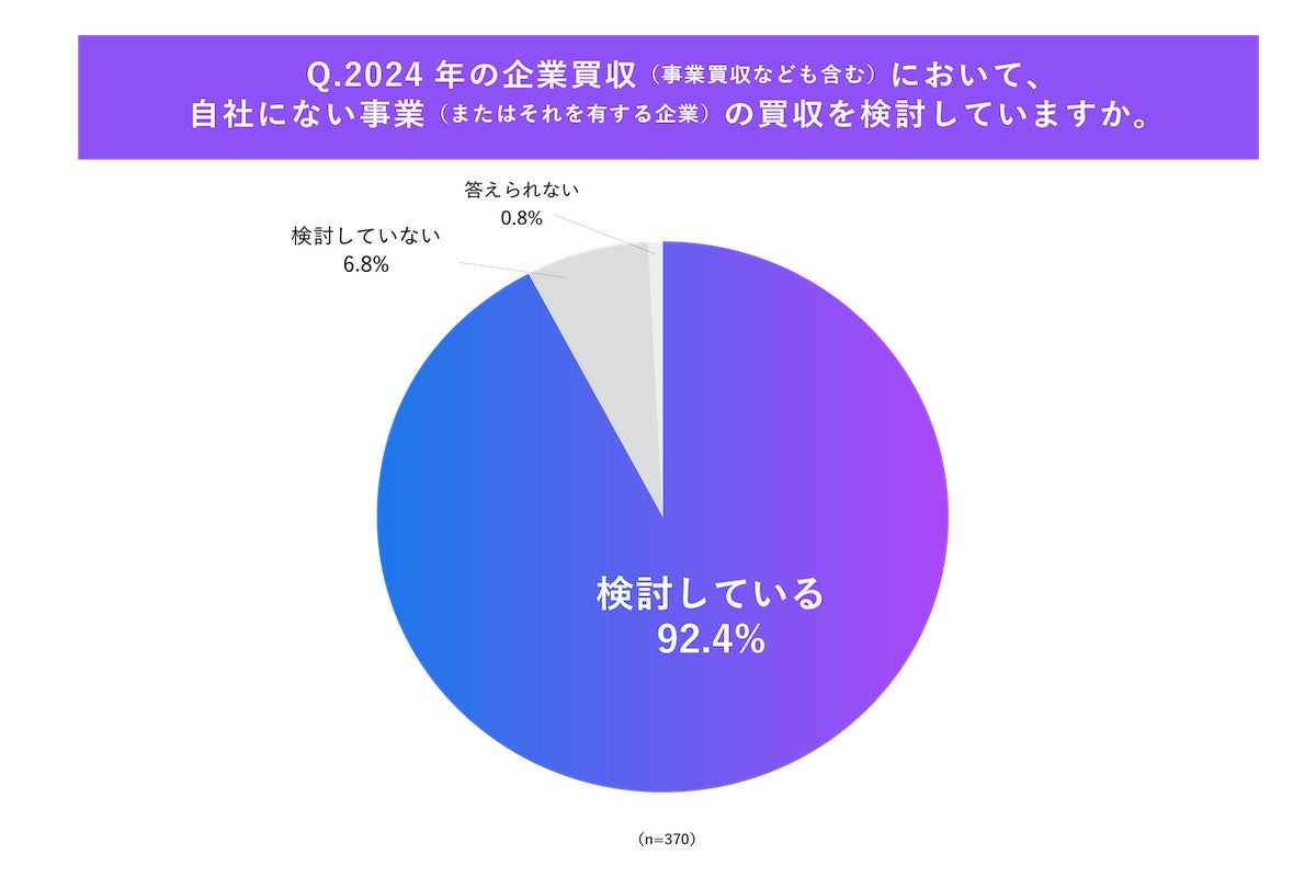 2023年は買収を実施した企業の約8割が異業種買収を実施していましたが、2024年に買収を検討している企業は9割を超えており、2024年はより異業種買収がより活発になることが考えられます。