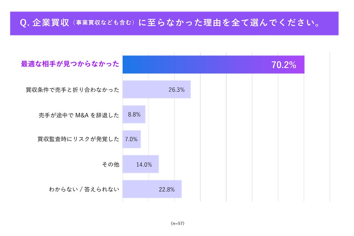 一方で、2023年に買収を検討したものの買収に至らなかった理由として「最適な相手が見つからなかった」が最も多く挙げられていたことから、買収するにあたり重要な要素として「マッチング」が鍵となることがうかがえます。