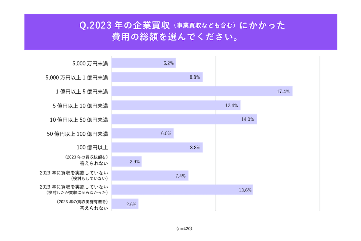 買収にかかった費用は1億円から50億円にかけての割合が特に高くなっていますが、100億円を超える買収も1割近く実施されており、企業によって幅広い規模で買収が実施されたことがわかります。