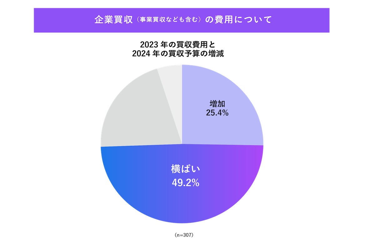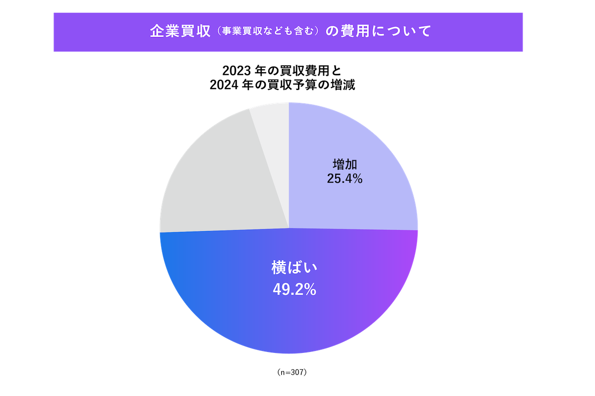 買収の検討度合いや目的は2023年と2024年でほぼ違いはなく、買収費用については2023年と比べてやや拡大していることがわかります。