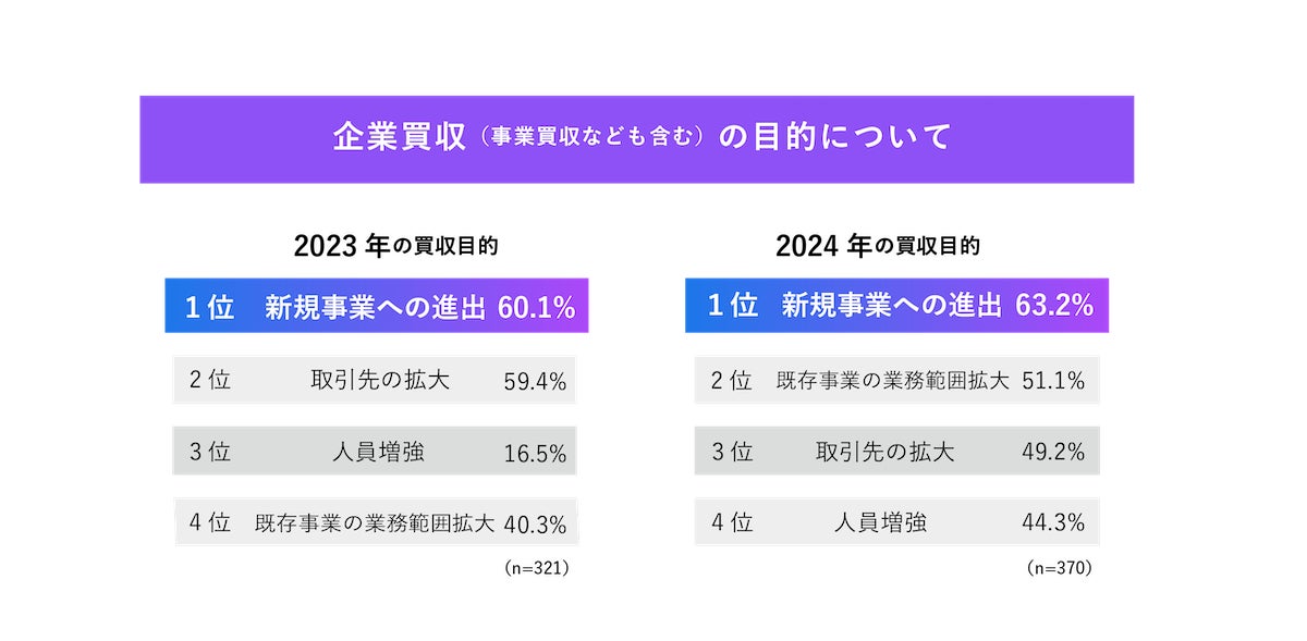 今回の調査結果から、2024年は異業種買収のニーズが2023年から引き続き高いことがわかりました。2023年と2024年の買収実績及び検討状況を比較すると、検討度合い、費用、目的がほとんど同じであったなか、2024年の「異業種の買収」については9割を超える企業が検討しており、買収そのもののニーズは大きな変化がないものの、異業種の買収についてはニーズが引き続き高まっていることがうかがえます。