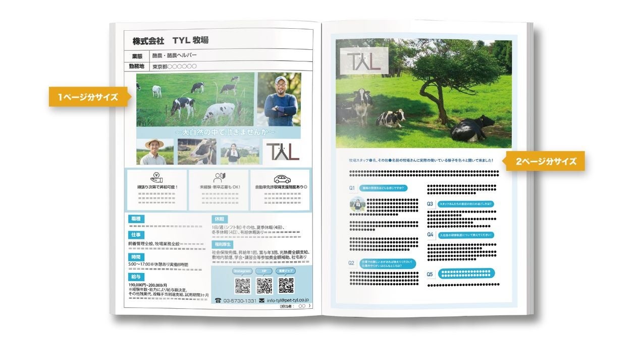 採用活動を始めるうえで面倒な求人票の「作成と送付」をまるっと代行し、専任の担当者が採用活動をサポート。求人情報をTYLに送るだけで、綺麗な装丁の求人情報誌に掲載されます。学校に求人票を送るのは1校でも大変ですが、『畜産ジョブ学生版』は全国600校以上の畜産関連教育機関(高校・専門学校・大学)に約20,000部発刊するため、確実に学生の手元に届けます。