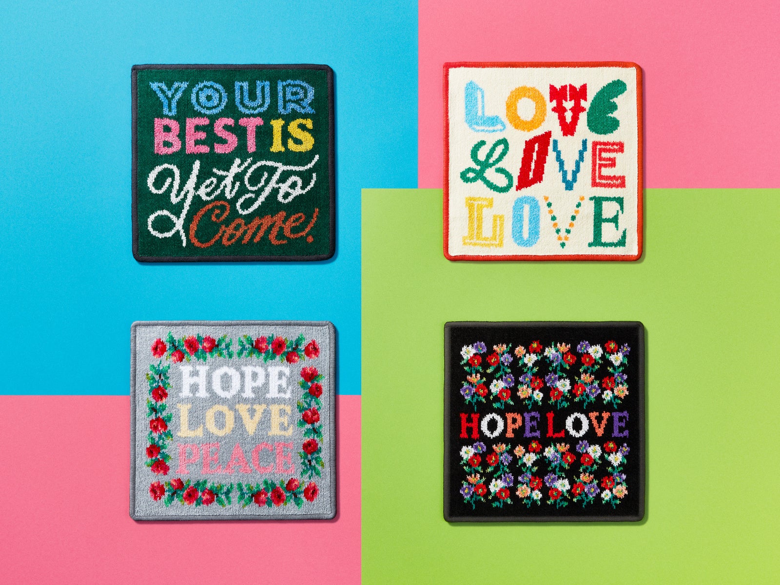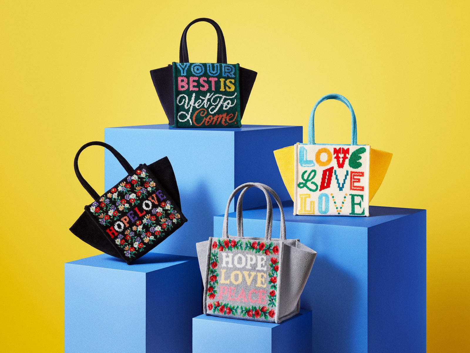 (左から時計回りに)『ホープラブ』/『ユアベストイズイェットトゥカム』/『スリーラブズ』/『ホープラブピース』バッグ 各¥24,200(税込) 約20×37×14cm