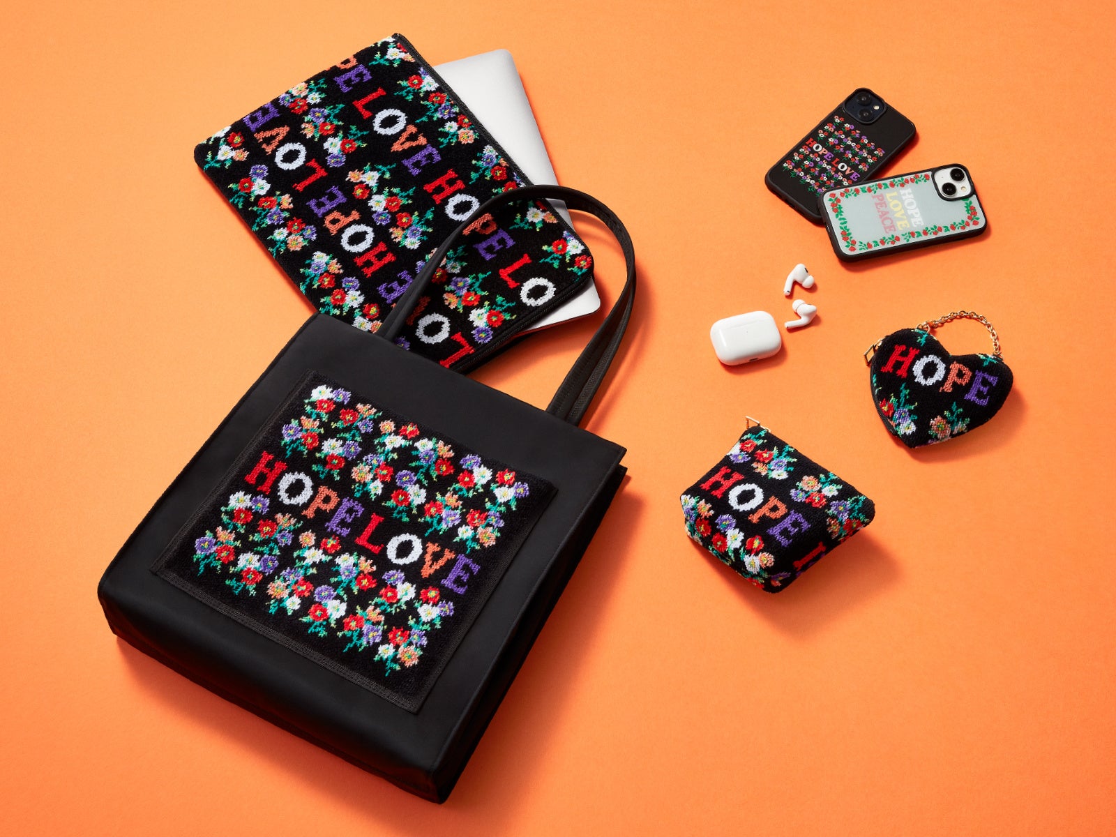 (左下から時計回りに)『ホープラブ』トート¥26,400(税込) 約33×30×9cm、『ホープラブ』PCケース¥12,100(税込) 約22×33cm、『ホープラブ』/『スリーラブズ』アクリルスマホケース(対応機種 iPhone14 /13)各¥6,050(税込) 約15×7.5×1cm、『ホープラブ』ハート型ポーチ¥7,700(税込) 約11×12cm、『ホープラブ』舟型ポーチ¥5,500(税込) 約10.5×14×4.5cm