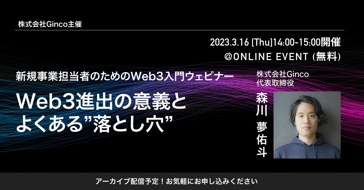 本ウェビナーでは、より多くの企業様がWeb3に対して前向きに取り組めるように、「Web3」に関する基本的な考え方から、実例をもとにしたWeb3新規参入時によくある”落とし穴”やその向き合い方について、Gincoの代表である森川が解説いたします。