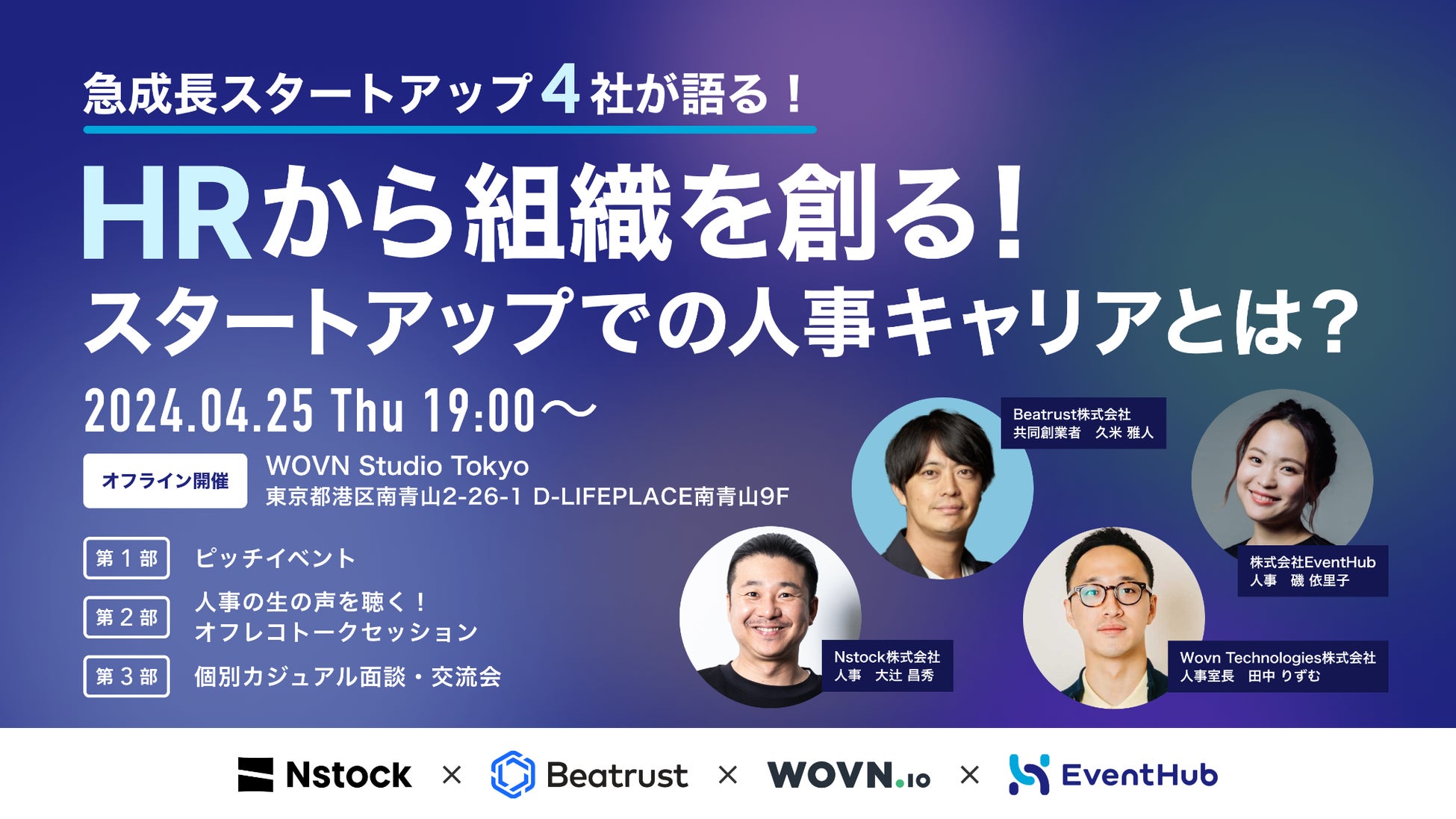 株式会社EventHub (東京都港区、代表取締役CEO:山本 理恵) が提供するシェアNo.1(※)イベント・ウェビナーマーケティングプラットフォーム「EventHub(イベントハブ)」は、4月25日(木)19:00〜 Beatrust株式会社・Nstock株式会社・Wovn Technologies株式会社と共同で、スタートアップの人事キャリアの魅力を語る、無料のオフラインイベントを開催いたします。
