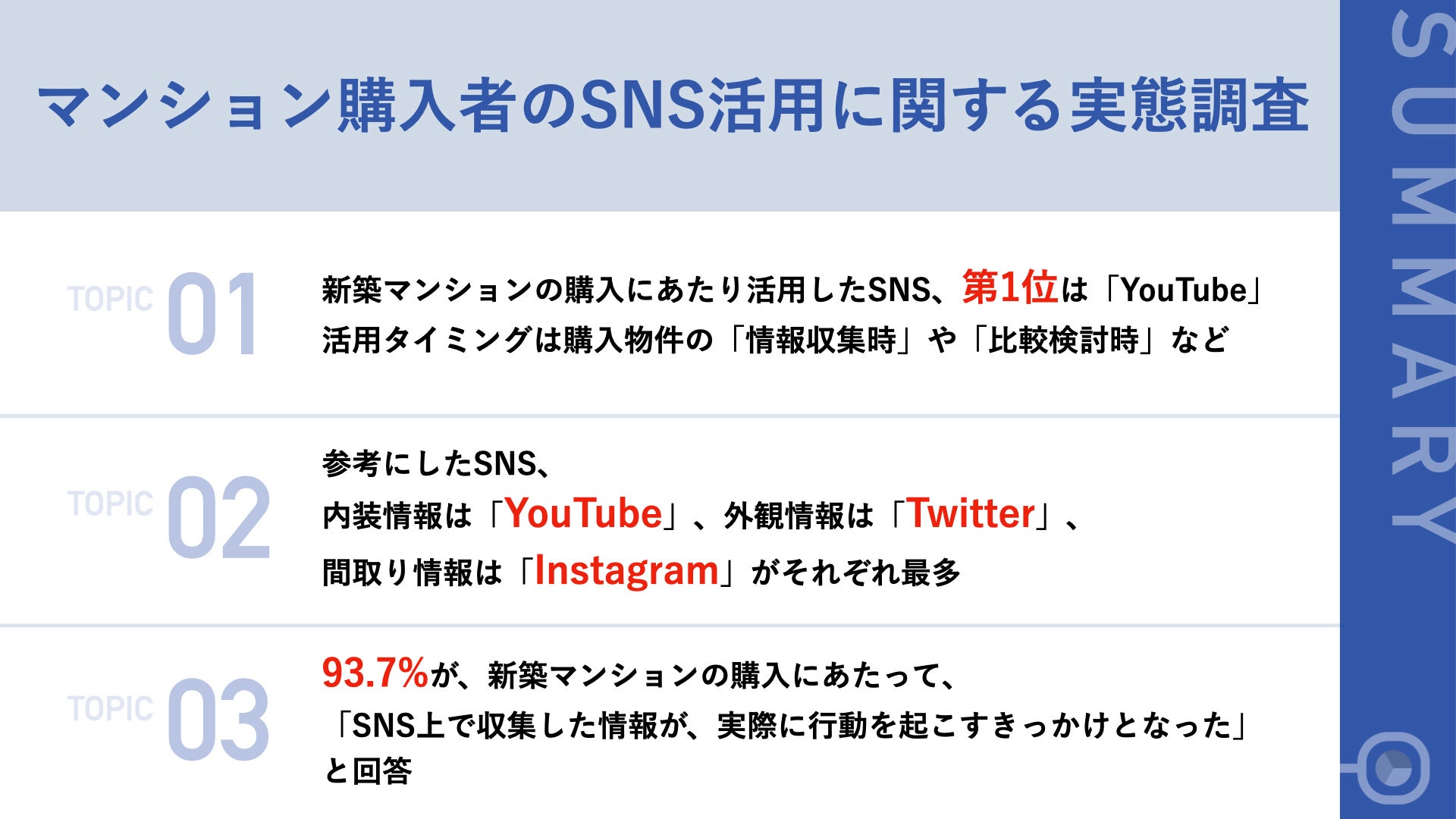 今回の調査では、人生でも大きな買い物といえるマンション購入に際して、SNSが購入を後押しするきっかけや、購入の最終的な決め手になることも多く、購入検討を開始した時点からあらゆるSNSで情報収集をする傾向が強いことが分かりました。SNS上で全ての情報を確認できるわけではありませんが、SNSで効果的に情報を届けていくことは、マンション販売における重要戦略であるといえるのではないでしょうか。