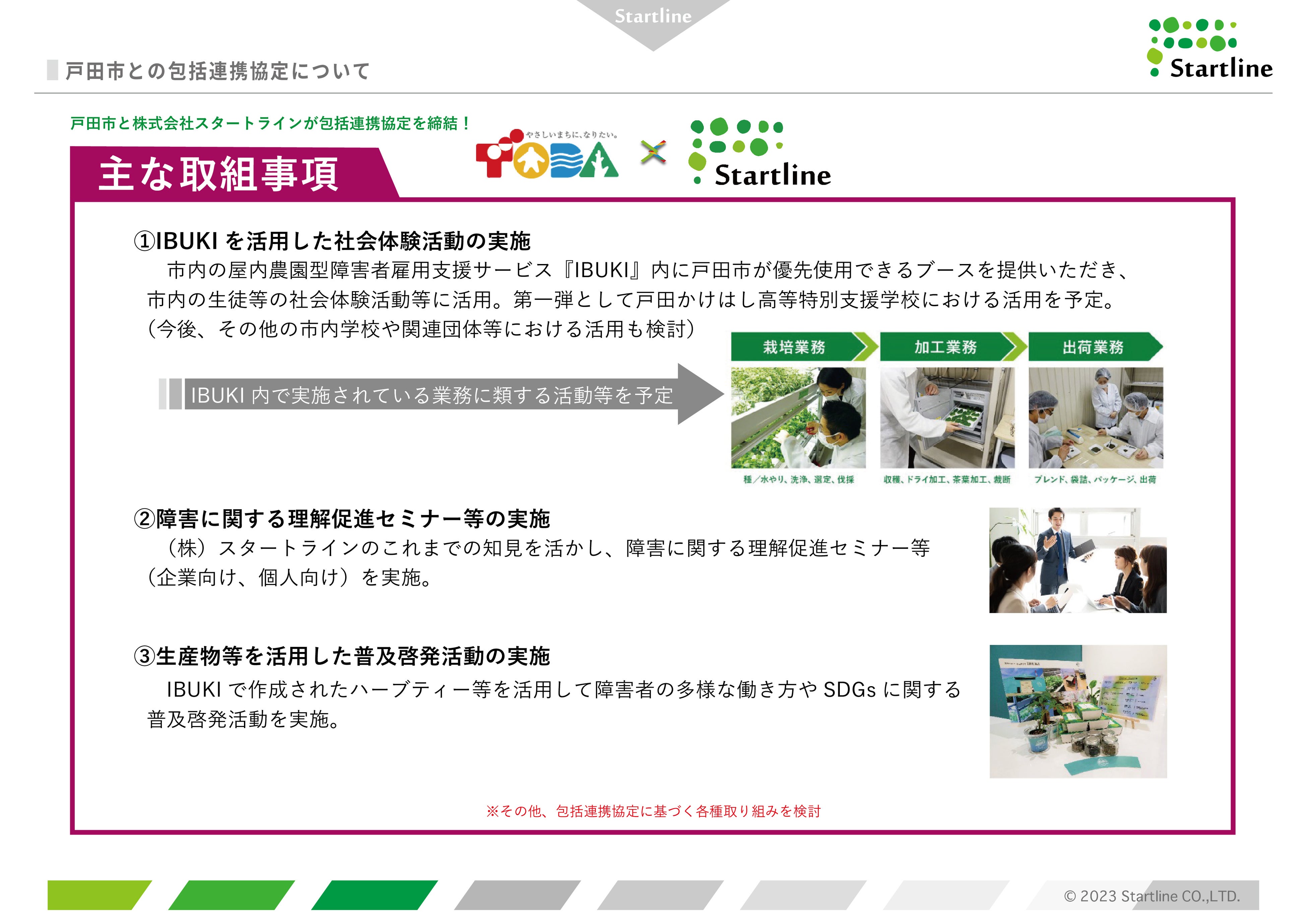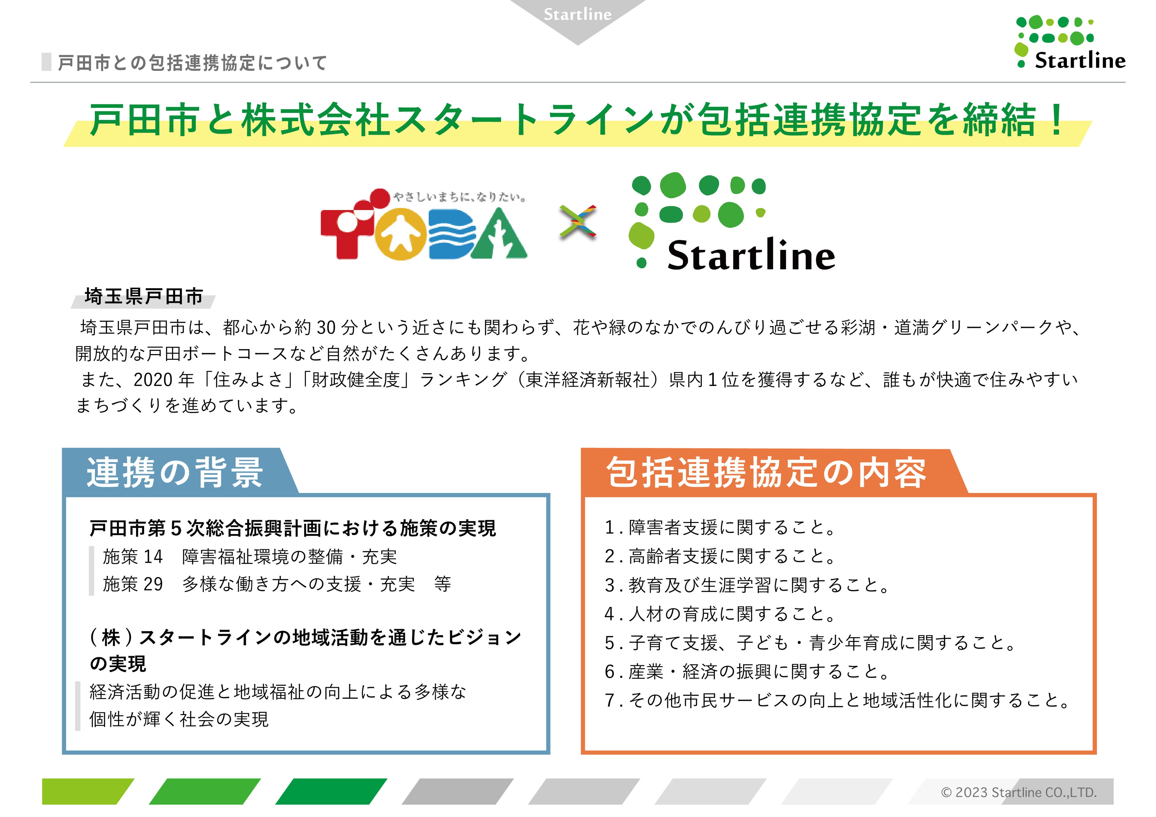 株式会社スタートライン (本社:東京都三鷹市、代表取締役:西村賢治、「以下、スタートライン」)と埼玉県戸田市(市長:菅原 文仁)は、双方の資源を活用し、市民サービスの向上と地域の活性化を目的として、2023年1月25日に包括連携協定を締結しました。