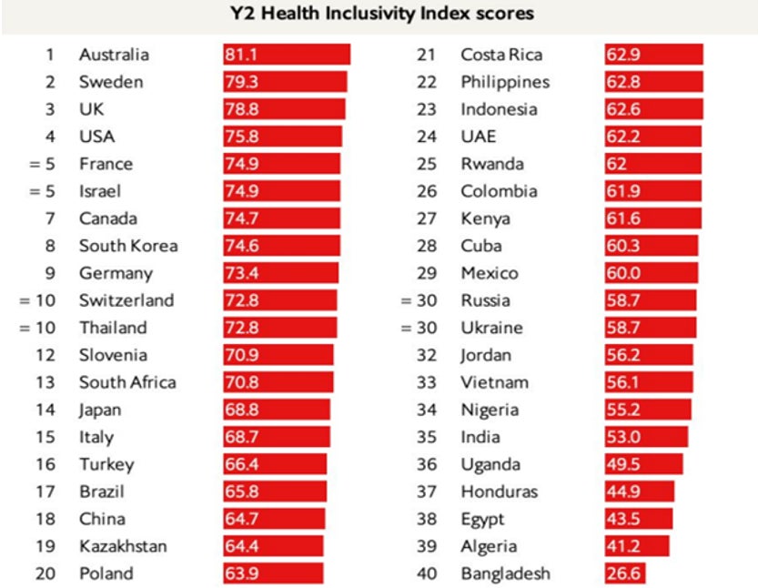 ヘルス・インクルーシビティ・インデックスの第2フェーズでは、オーストラリアが最も高いスコアを獲得し、スウェーデン、英国、米国、フランス、イスラエル、カナダ、韓国、ドイツ、スイスおよびタイがそれに続いています。