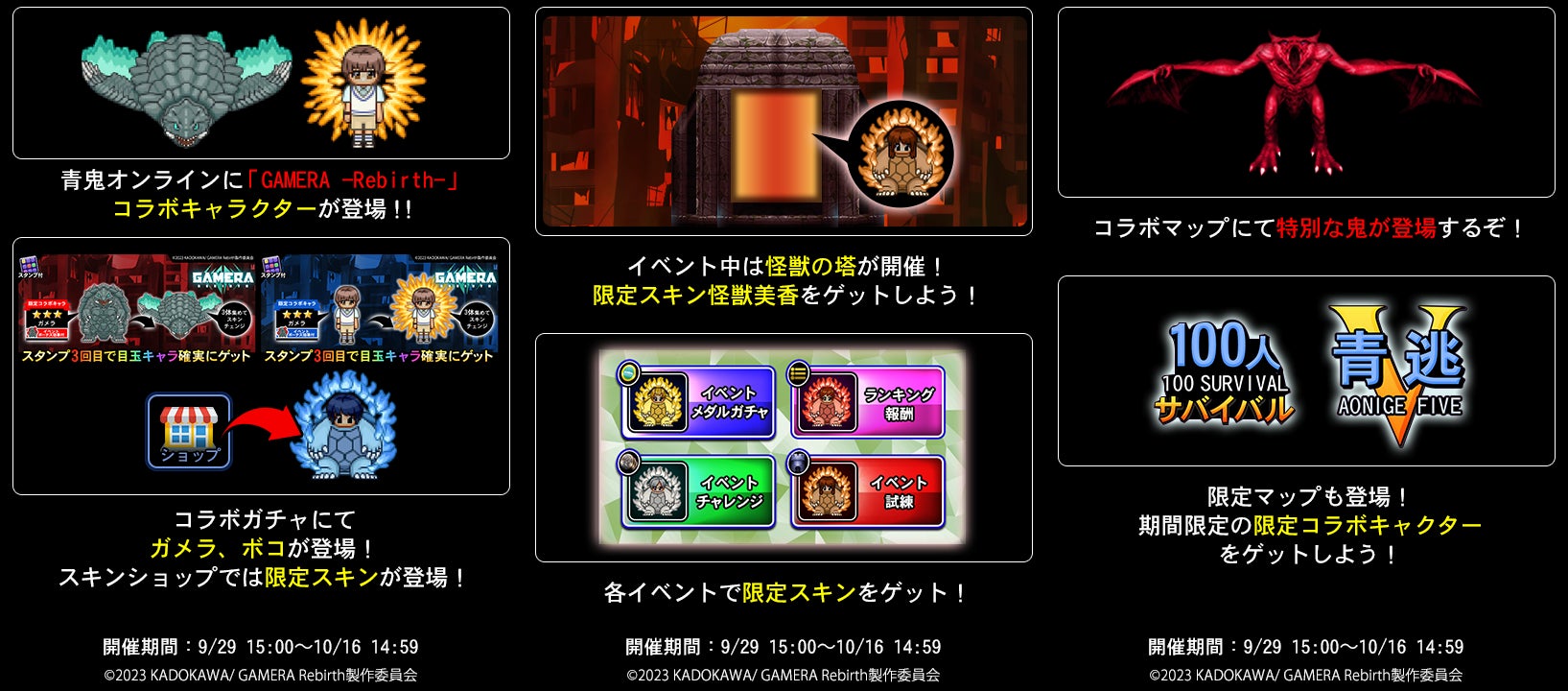 青鬼オンラインに、ガメラをはじめとしたアニメ『GAMERA -Rebirth-(ガメラ リバース)』のキャラクターが青鬼オンラインのコラボスキンとして登場!