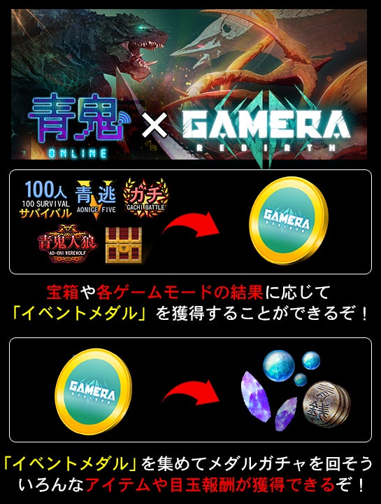 株式会社GOODROID(本社:東京都目黒区、代表取締役社長:松田和彬)は、最大100人のキャラクターが青鬼から逃げ回るマップの中で最後の一人として生き残ることを目指すオンライン・サバイバルゲーム『青鬼オンライン』にて、アニメ『GAMERA -Rebirth-(ガメラ リバース)』コラボイベントが9月29日15:00より開始したことをお知らせいたします。