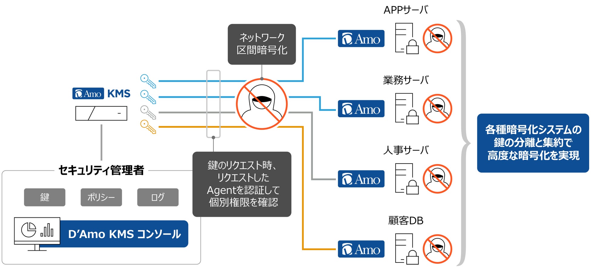 サイバー攻撃による個人情報漏えい事故が多発する昨今、データ暗号化によるデータ保護対策の重要性は高まっており、暗号化することでデータを安全に保護する「D’Amo」は、デジタル社会に不可欠な製品と言えます。しかし、暗号化対象のシステムが増加するに従い、暗号鍵の種類と数が増加する傾向にあり、セキュリティ管理者には適切な暗号鍵の維持と管理が求められます。つまり、適切に管理されていない暗号鍵は、データの機密性を担保する暗号化対策に脆弱性を招くことになります。
