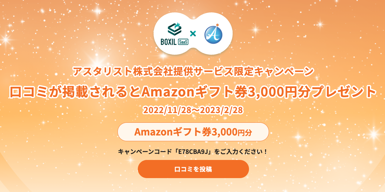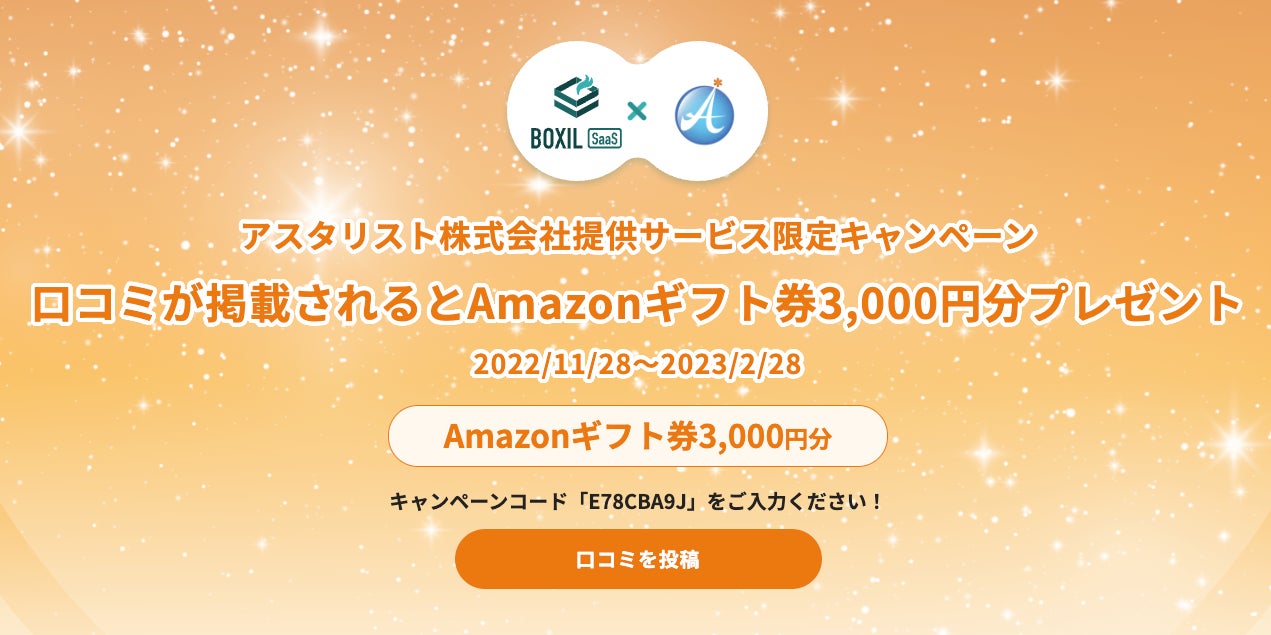 SaaSの連携によって業務の自動化を実現するエンタープライズiPaaS「ActRecipe」を提供するアスタリスト株式会社(本社:東京都港区、代表取締役CEO:池上大介、以下「アスタリスト」)は、スマートキャンプ株式会社(本社:東京都港区、代表取締役社長:林詩音、以下「スマートキャンプ」)は、スマートキャンプが運営するSaaS比較サイト「BOXIL SaaS(ボクシル サース)」にて口コミ投稿をすると、1件につき3,000円のAmazonギフト券が当たるキャンペーンを、2022年11月28日から2023年2月28日まで実施します。