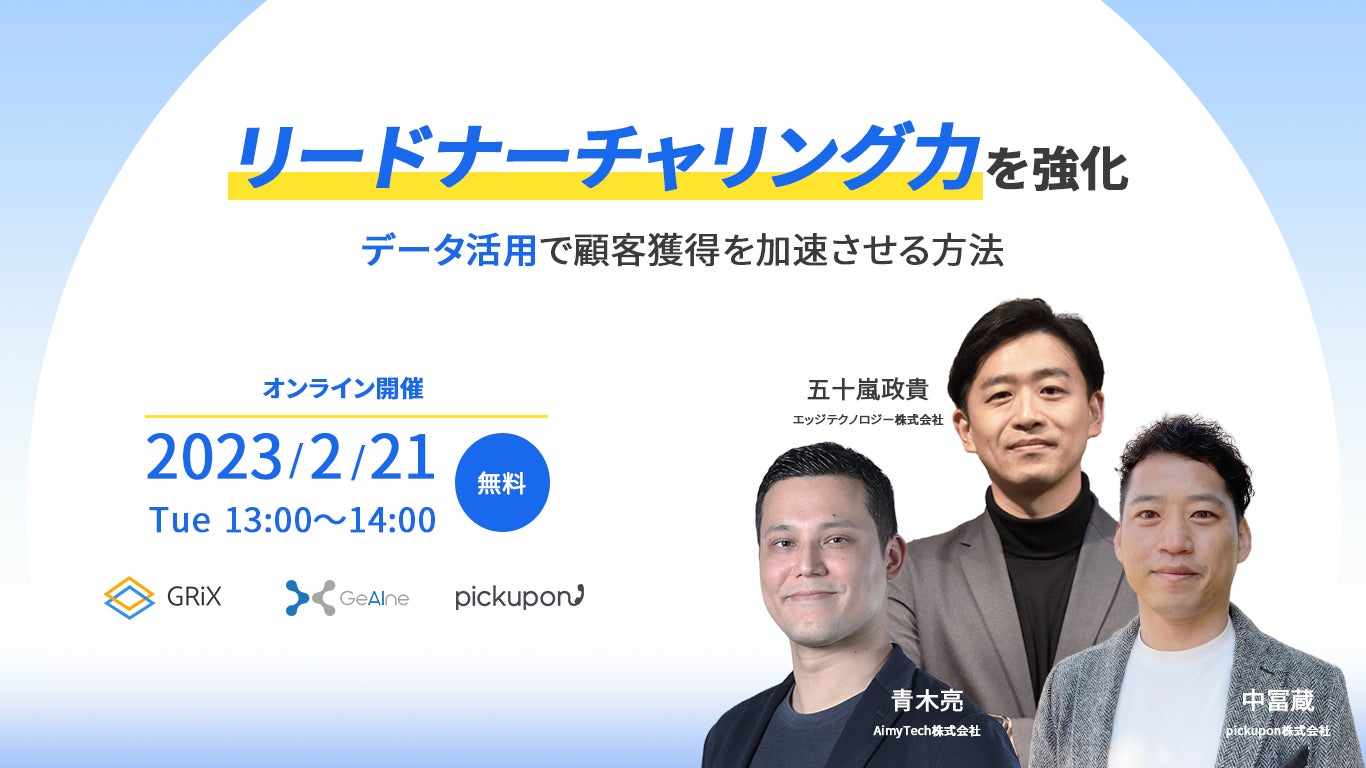 会話サマリーAI電話”pickupon(ピクポン)”を提供するpickupon株式会社(千葉県市川市、代表:小幡 洋一、以下ピクポン)は、人工知能を搭載した営業支援ツール「GeAIne」を提供するエッジテクノロジー株式会社(東京都千代田区 代表:住本 幸士)と、B2B商談に新しいデジタル接点を与える営業支援ツール「GRiX」を提供するAimyTech株式会社(東京都渋谷区、代表:青木 亮)と共に、オンラインセミナーを2023年2月21日(火)に開催します。