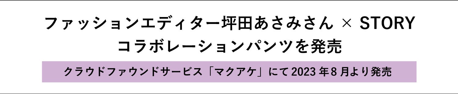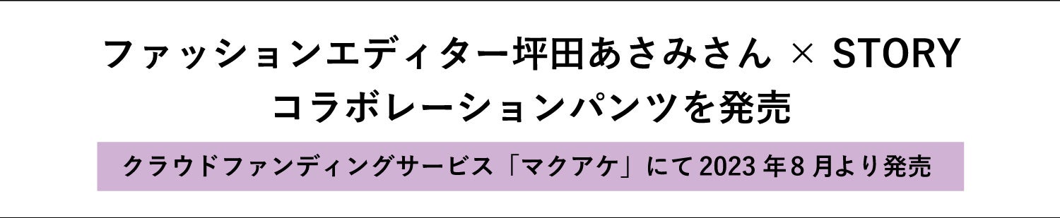 株式会社コスギ( 本社:東京都中央区 / 代表取締役社長:小杉佐太郎)が運営するパンツ専門ブランド STORY(ストーリー)は、『Marisol』『éclat』などの女性ファッション誌などで活躍されているファッションエディターの坪田あさみさんとのコラボレーションパンツを8月10日(木)より販売を開始いたします。