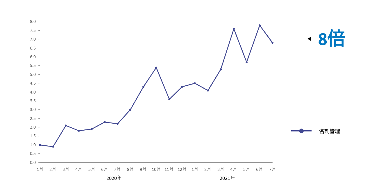 - 2020年1月の月間PV数を1.0とした場合の、「名刺管理」カテゴリー月間PV数比率