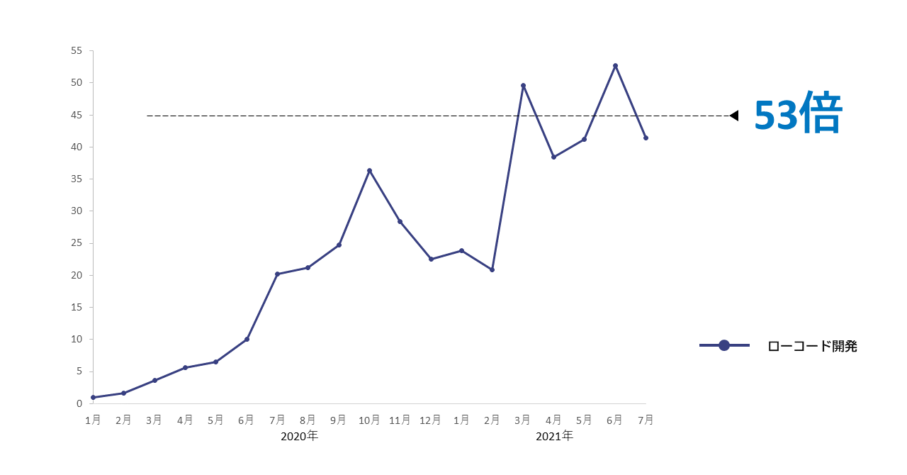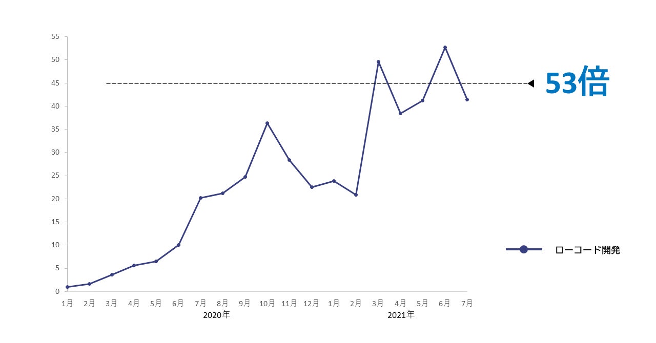 - 2020年1月の月間PV数を1.0とした場合の、「ローコード開発」カテゴリー月間PV数比率