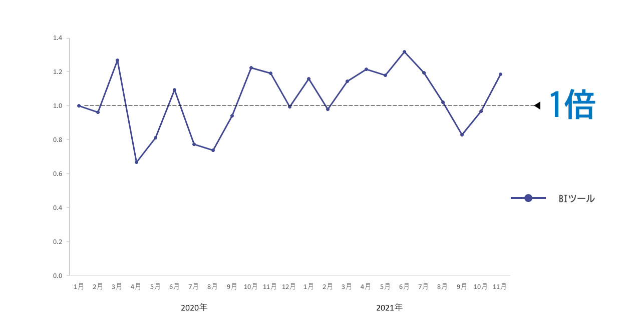 - 2020年1月の月間PV数を1.0とした場合の、「BIツール」カテゴリー月間PV数比率