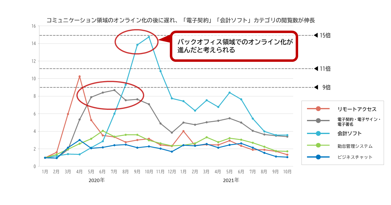 - 一歩遅れて「電子契約」や「会計」といったバックオフィス領域のオンライン化が続く