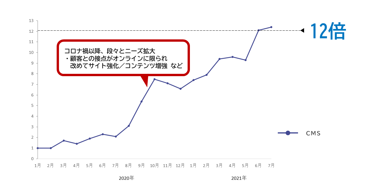 - 2020年1月の月間PV数を1.0とした場合の、「CMS」カテゴリー月間PV数比率