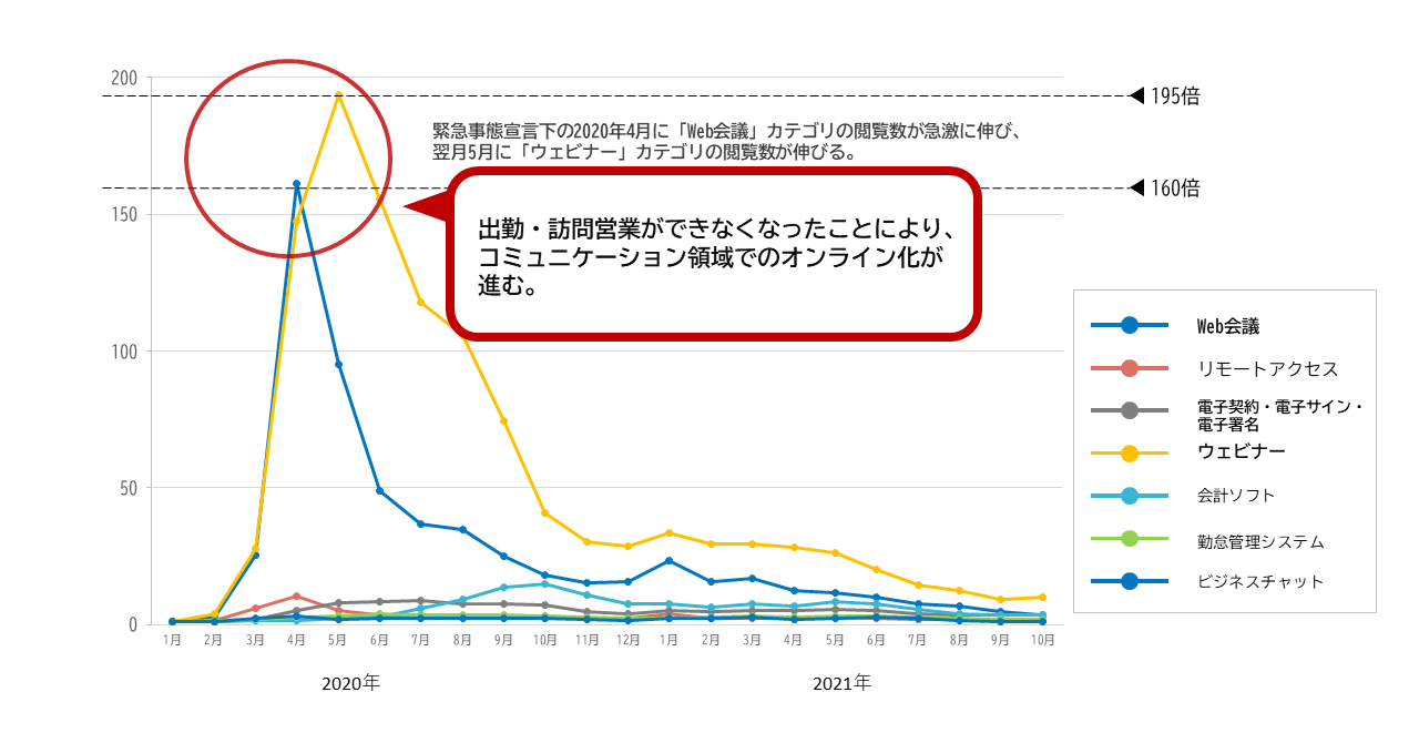 - コロナ禍において、「Web会議」「ウェビナー」などコミュニケーション領域のオンライン化が急速に進行