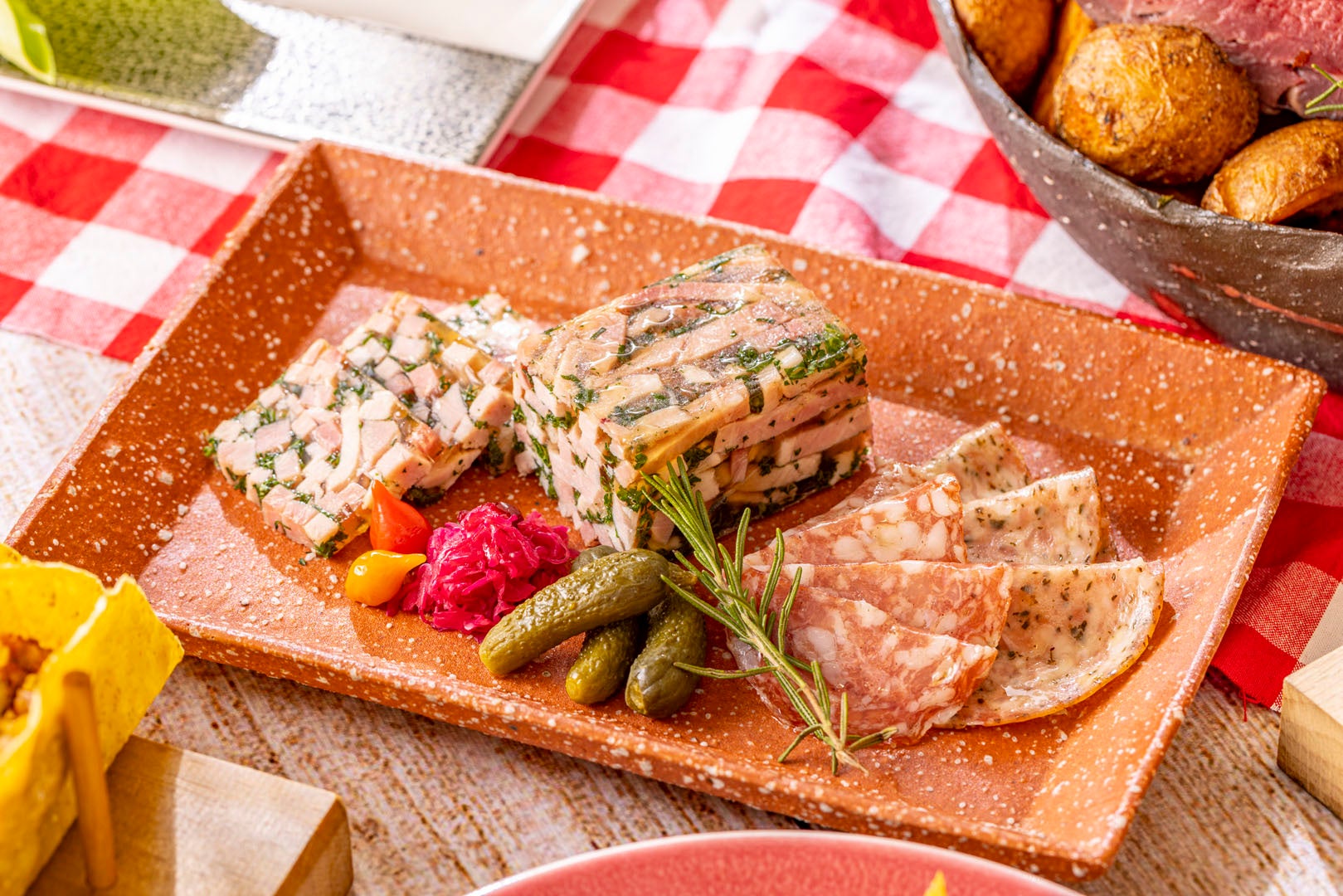 やわらかいハムをパセリなどの香草とともにコンソメゼリーに閉じ込めました。それぞれの旨みが折り重なり、豊かな味わいに。