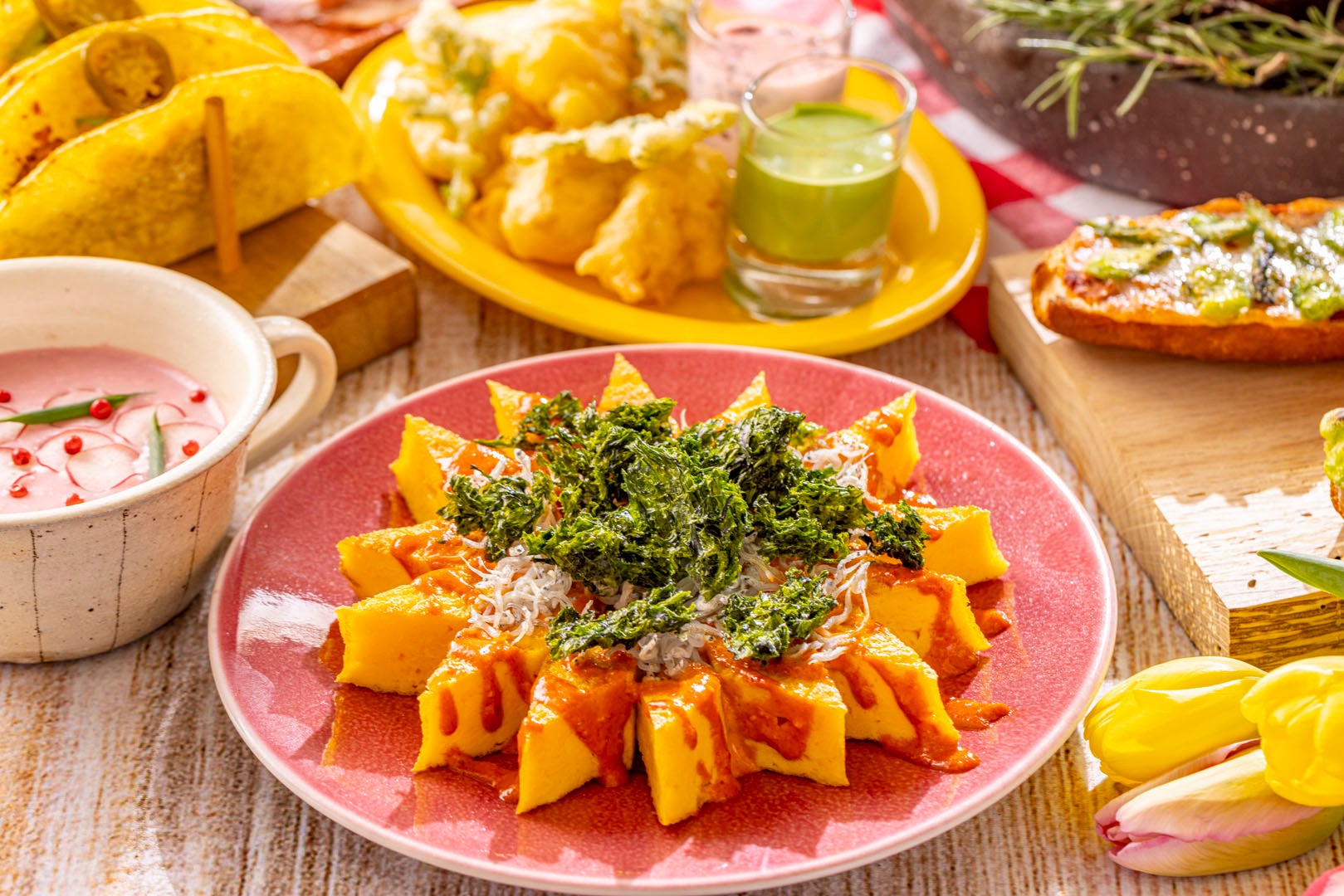 オムレツの黄色にプリカのオレンジ色のソースが鮮やかに映える一品。仕上げに、あおさとシラスを散らし、磯の香りを添えました。