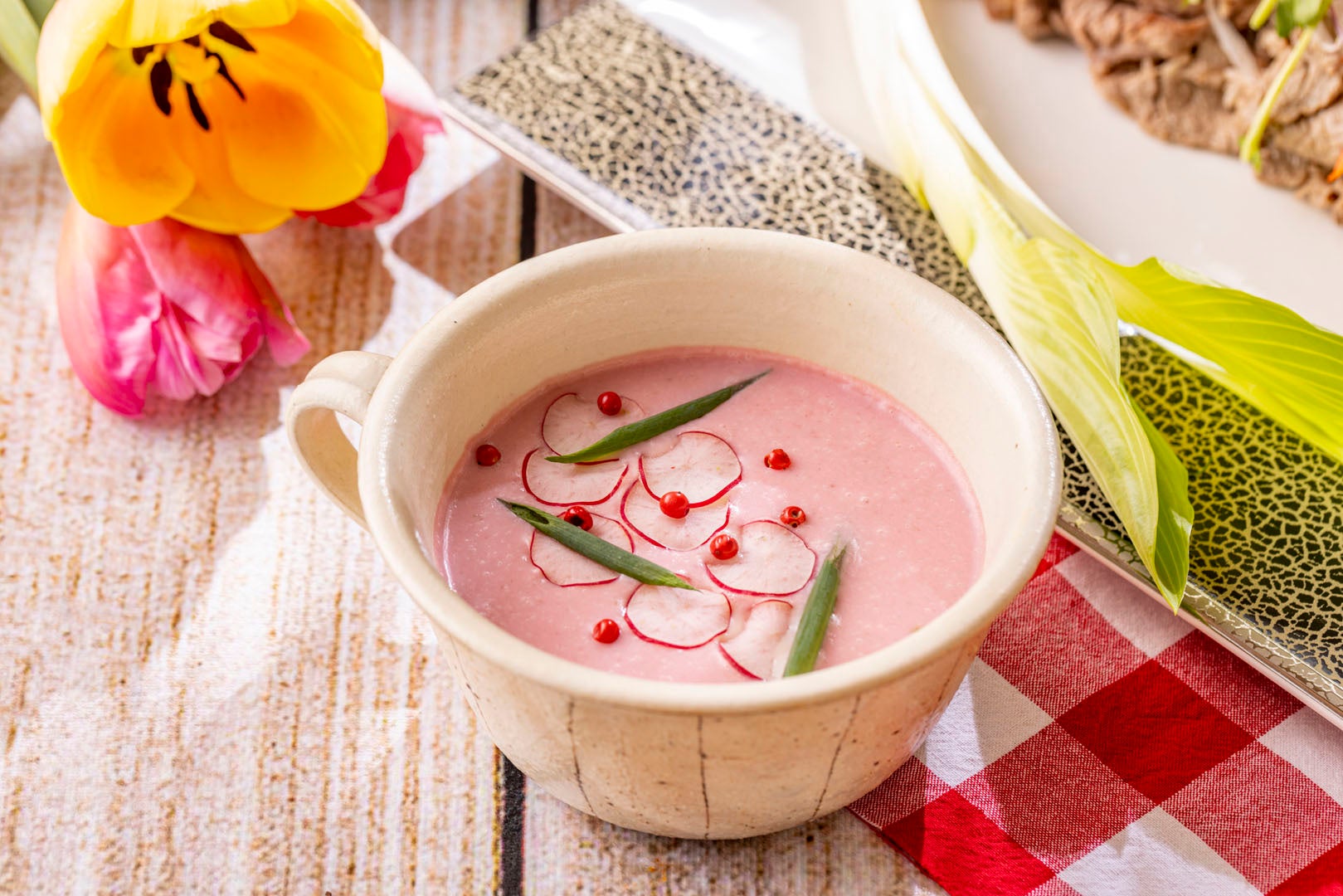 鮮やかな桜色は思わず写真に収めたくなるような映え感のある一品。桜の花の塩漬けを使って調味しました。