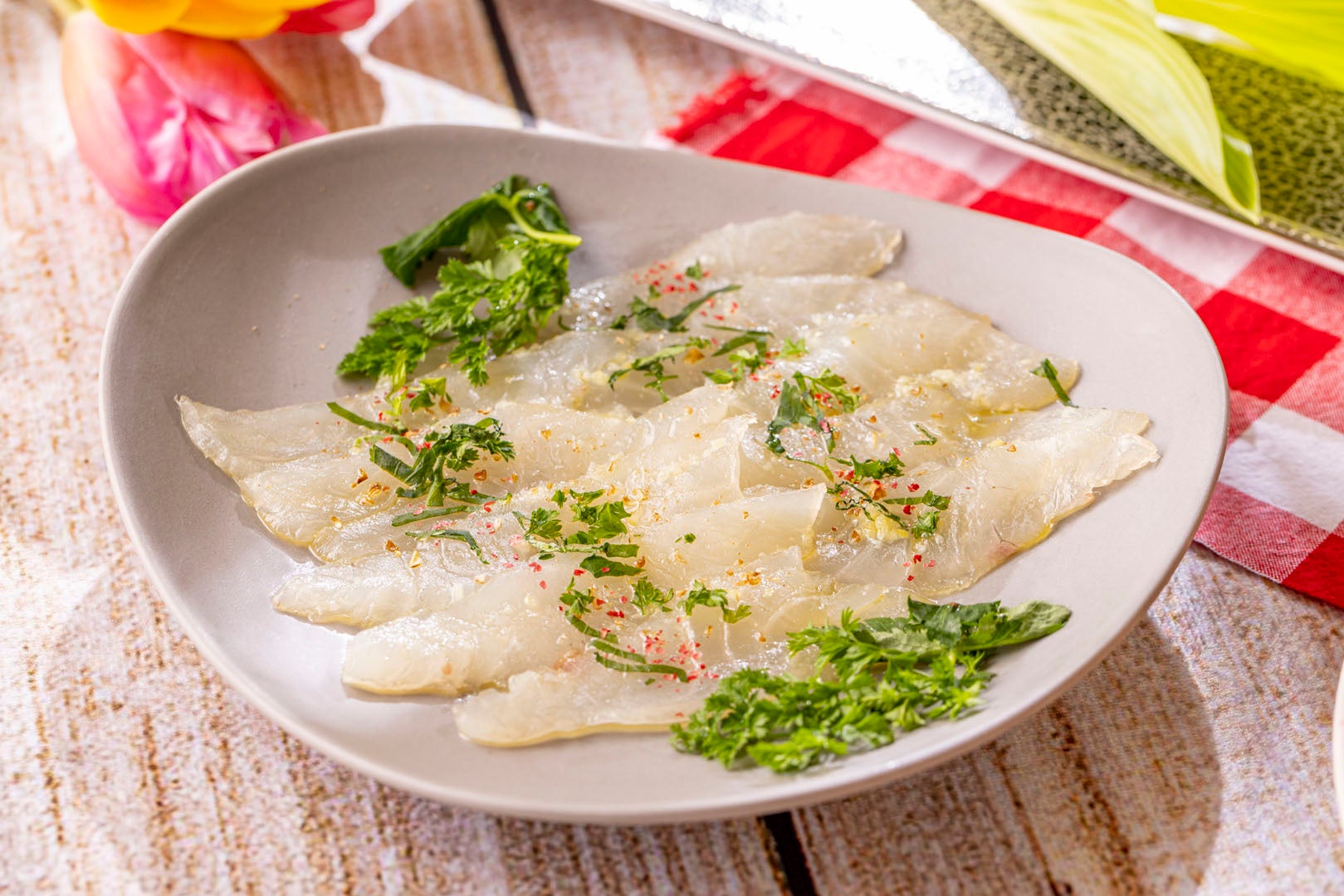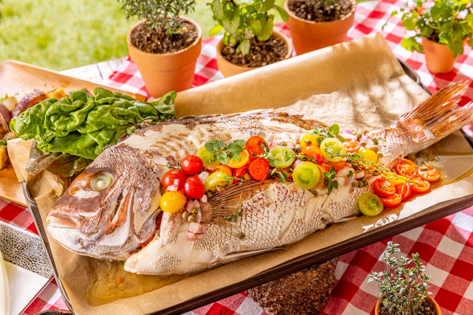 ハーブでマリネした鯛を丸ごと蒸し上げることで、身がふっくら。ケッカソースの酸味が淡白な鯛の旨みを際立たせます。