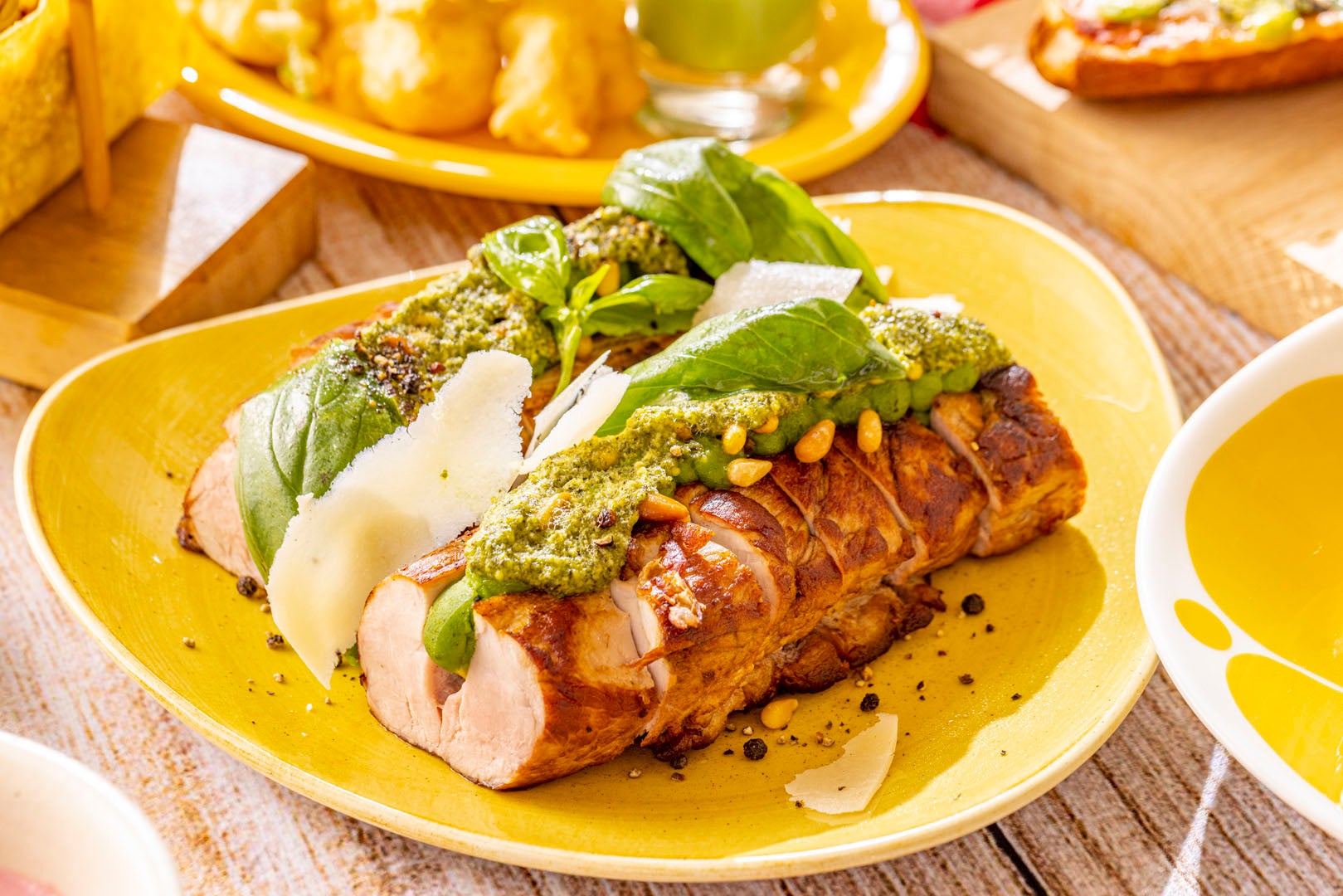 脂身が少なく、肉のうまみが強いフィレ肉にジェノベーゼ風味のポテトピュレを詰めてジューシーにローストしました。