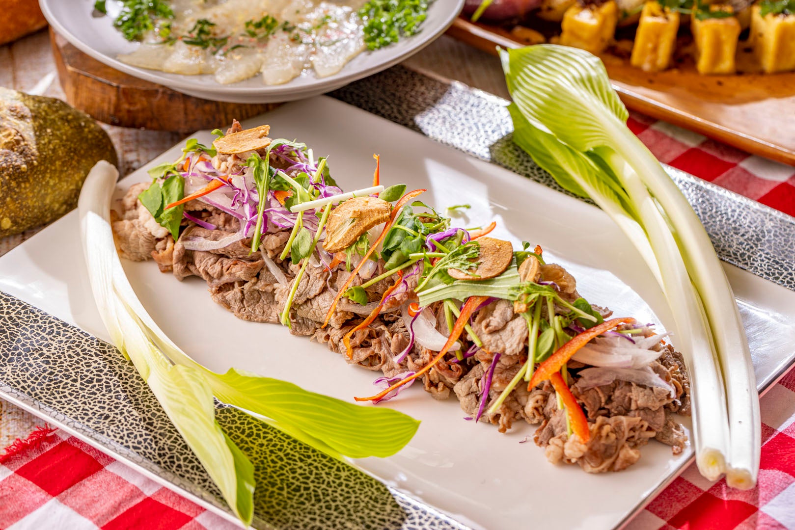 新鮮な野菜をご提供しているサラダのコーナーに、週末には、土日祝日限定メニュー「ハーブ&スパイスしゃぶしゃぶサラダ」も登場。薄切りビーフを湯引きするお湯にオレガノやタイムを使用し、ビーフの旨みを存分に引き出しています。玉ねぎのスライスやクレソンなど野菜のフレッシュな香りとともにお召し上がりください。
