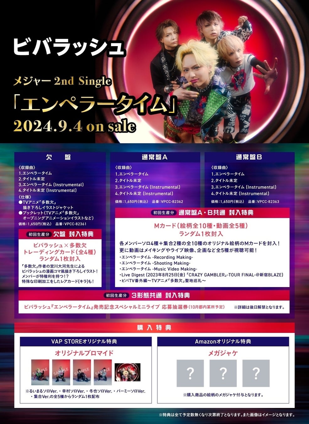 今回エンディングテーマに決定した「シェキラBANG-BANG!!」が収録されるシングルは全3形態で9月4日(水)発売、表題曲の「エンペラータイム」は、7月2日(火)より日本テレビほかで放送中のTVアニメ『多数欠』のオープニングテーマとなっている。