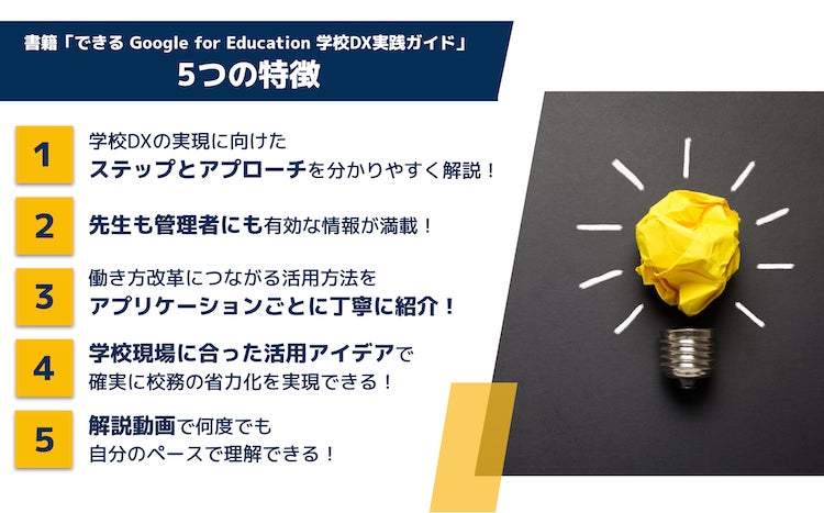 本書は、日本の学校教育にとって緊要な課題である学校DXを力強く促進させるための具体的なアプローチから、クラウドツールである Google for Education™ の魅力を最大限に発揮して実現する学校DXのアイデアまで幅広く掲載した実践ガイドです。