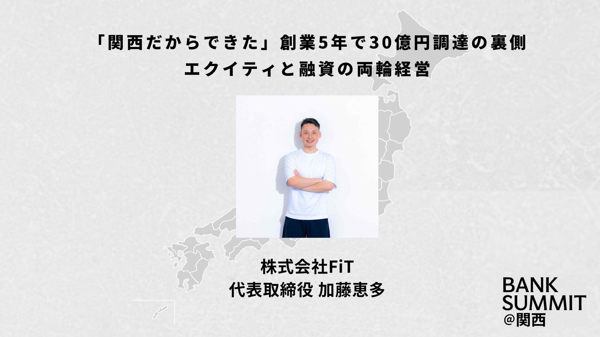 京都大学在学中に株式会社FiTを創業し、5年で累計30億円の資金調達を成し遂げた加藤 恵多氏が登壇。スタートアップの成長戦略において、なぜ創業時からエクイティと融資の両輪で資金調達が実現できたのか。本セッションでは、創業時に投資をしたTHE SEEDに加え、日本政策金融公庫と京都銀行の担当者が登壇し、関西だからこそ可能だった資金調達の裏側をお話しします。