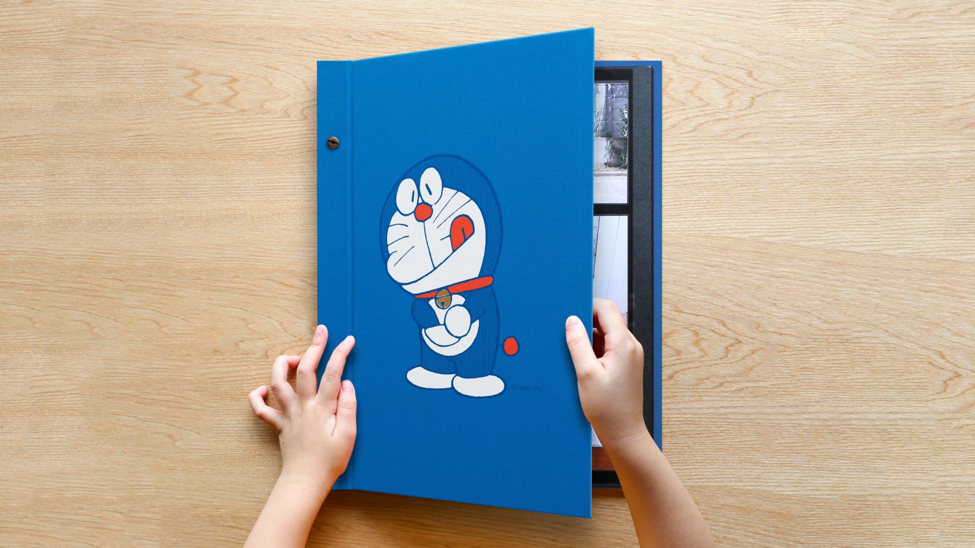 「ALBUSBOOK ドラえもん」は、10年後、20年後にも家族みんなに愛着を持ってもらえるよう、表紙はシンプルにドラえもんを大きくプリント。アルバムの布地はドラえもんのイメージカラーのブルーにして、手にしたときにしっくりとくる落ち着いた色合いに仕上げました。