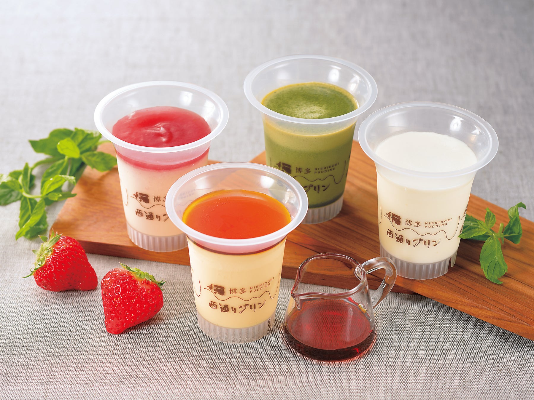 西通りプリンの味の原点であるカスタードプリンの「ポシェ」をはじめ、濃厚ミルクや八女茶、あまおうなど豊富な種類のプリンを取り揃えています。ぜひお気に入りの一品を見つけてください!