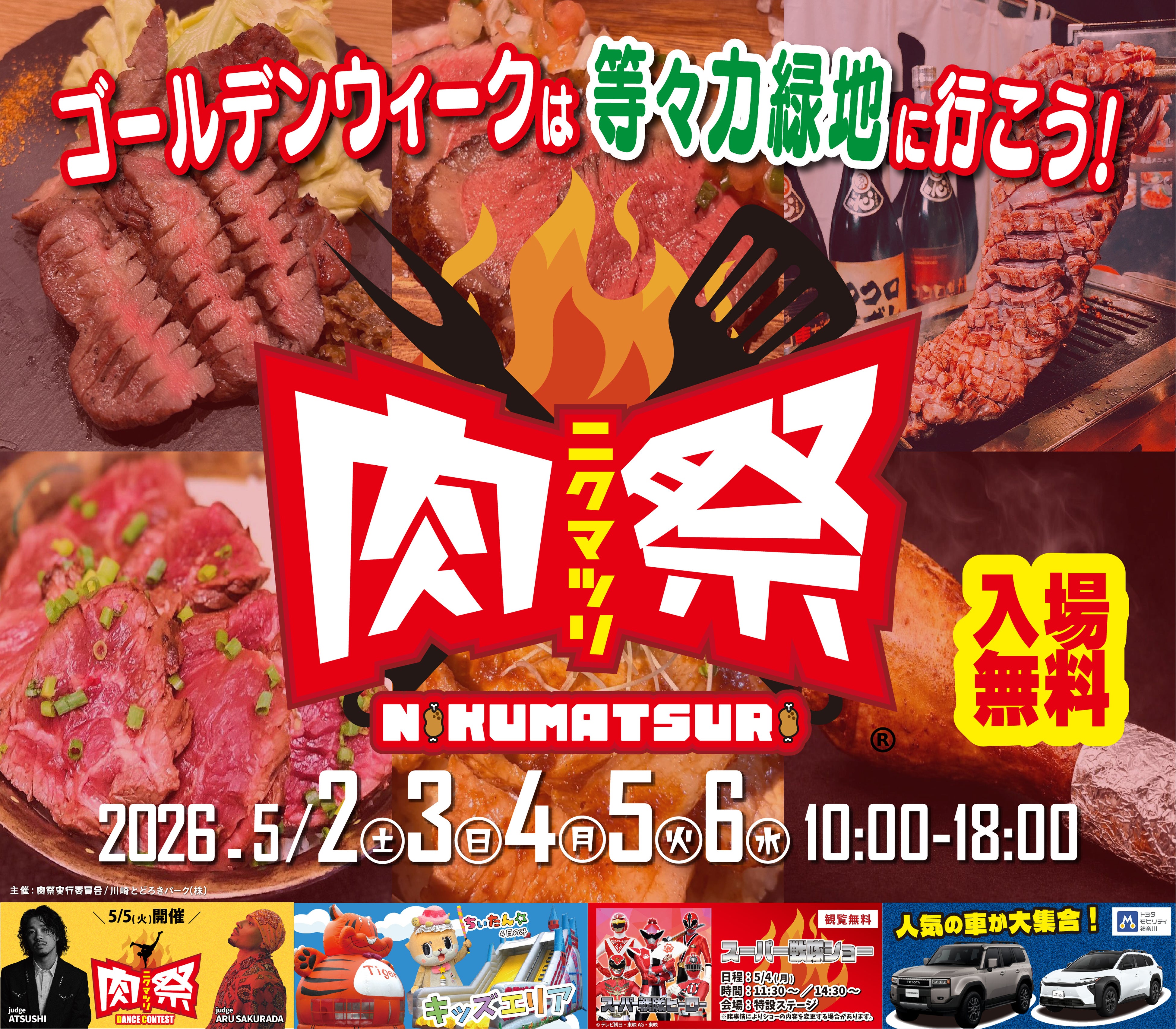 2026年5月2(土)~6日(水・振休)<5日間>、神奈川県川崎市中原区「等々力緑地〜催し物広場〜」にて、『肉祭2026in等々力緑地』 を開催いたします。焼き物・揚物・ご飯ものなど、素材に"ひと手間"加えた、彩り豊富な旨い肉料理が集結。クラフトビールやスイーツなどが集まります。公式ソングのライブパフォーマンスやDJなどライブステージも盛りだくさん!昨年大盛況だったダンスコンテストや、ヒーローショーも予定。キッズエリアではエアー遊具(ふわふわ)も登場。ファミリーでもカップルでも友達同士でも楽しめるコンテンツが盛りだくさん!
