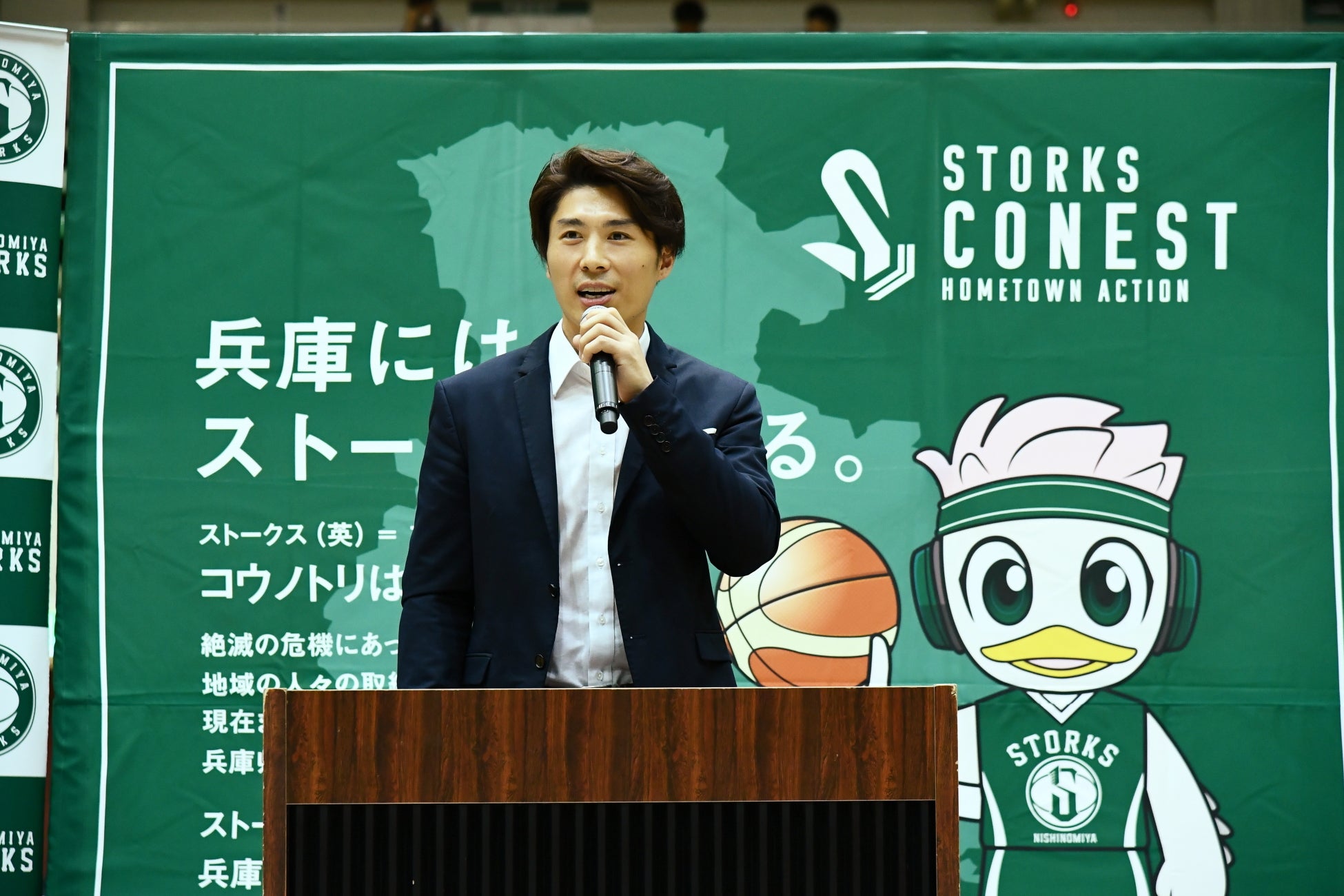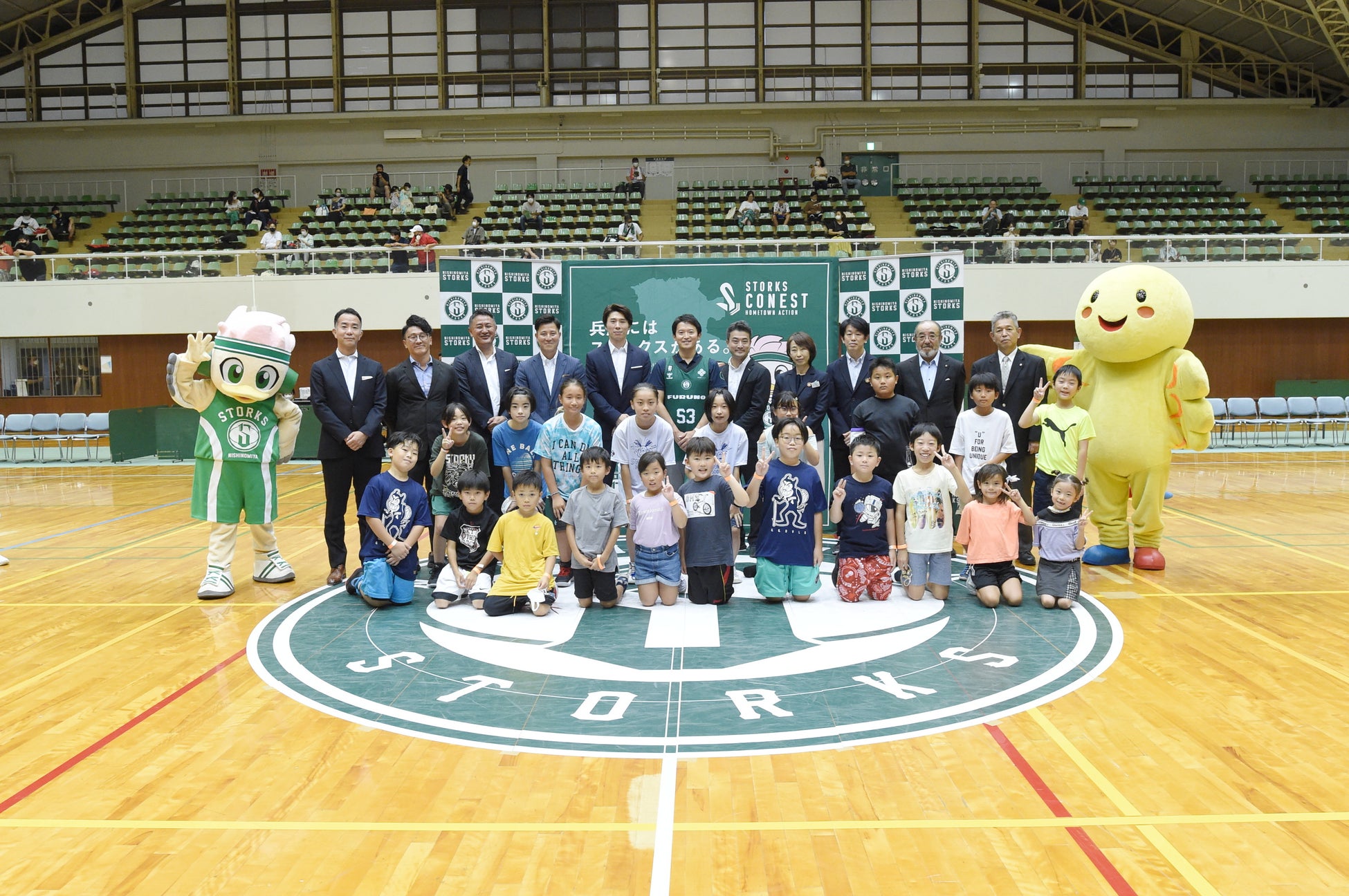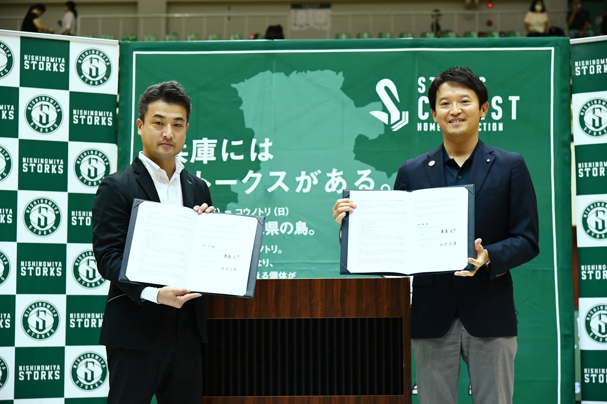 西宮ストークスは、8月31日(水)に西宮市立中央体育館で開催されたプレシーズンゲーム(西宮ストークスvs大阪エヴェッサ)の試合前に、兵庫県との包括連携協定の締結式を行いました。締結式には、兵庫県知事の齋藤元彦様にご出席いただき、西宮ストークス代表取締役の北村正揮と協定書にサインしました。この包括連携協定の締結により、兵庫県と西宮ストークスでは、①兵庫県のスポーツ振興 ②水に対する取り組み ③兵庫県の県産品や観光のPR ④地域の賑わい創出 を主な目的として共に活動を行っていきます。ストークスとしては、昨年10月に「STORKS CONEST(ストークス コネスト)」という地域活動プロジェクトを立ち上げており、「水」と「子ども」を大きなテーマとして活動を重ねてきました。地域の学校に出向いて子どもたちに向けたバスケットボール教室や職業講話を開催したり、県内の水辺の清掃活動やワークショップを企画したりと、これまで約100回の活動で延べ13,000名以上の方々と活動してきました。この包括連携協定をきっかけに、さらに活動の幅を広げ、関わる人の輪を広げていきます。