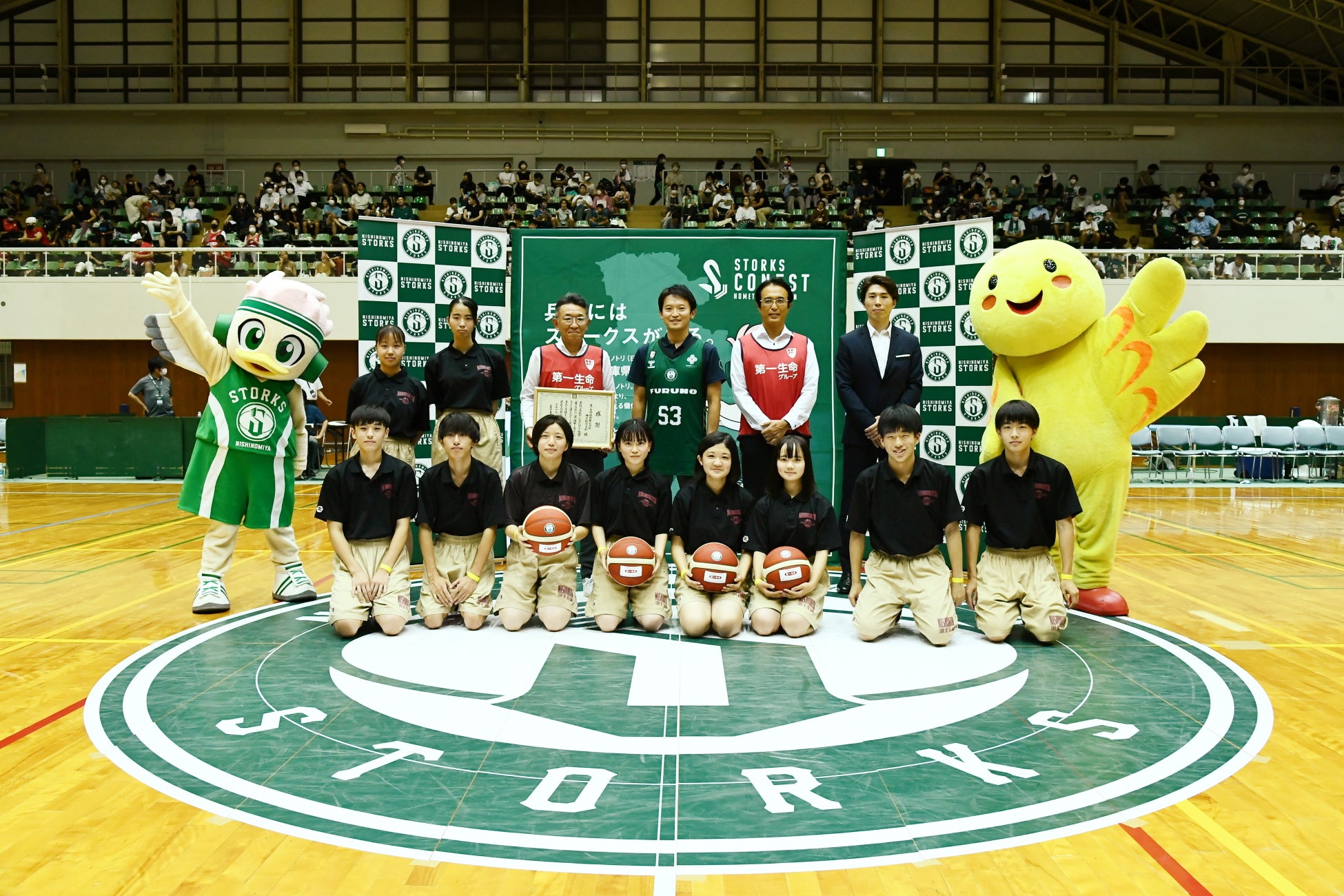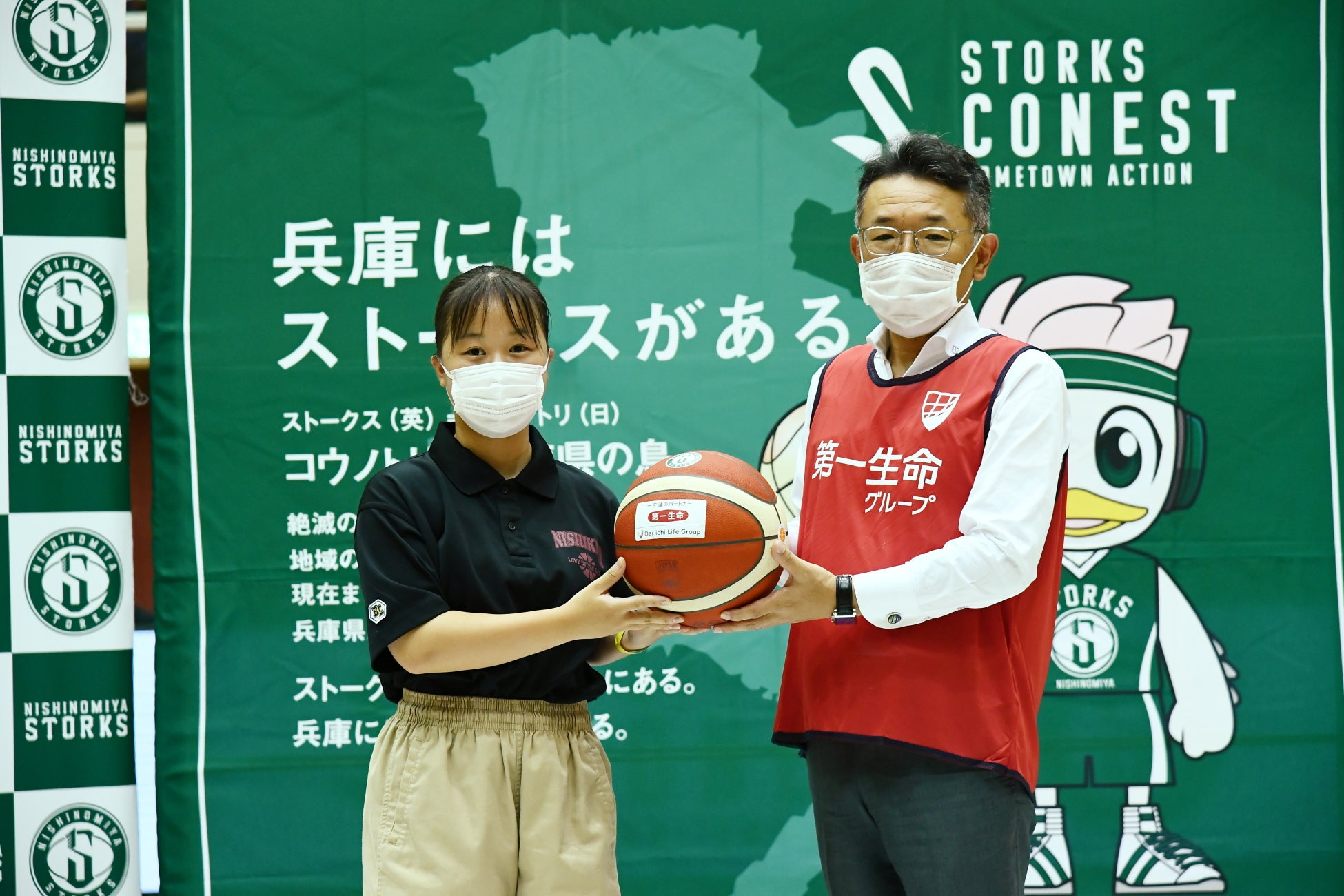 また、包括連携協定の取り組みの一環として、西宮市の兵庫県立高校8校に、新品のバスケットボールを寄贈するプロジェクトも発表し、ボールの贈呈式を開催しました。当取り組みは、第一生命保険株式会社の協賛により実現し、今後もストークスのパートナー様のご協力のもと、兵庫県内の小中高にボールやビブスなど不足している備品を寄贈するプロジェクトを推進していきます。