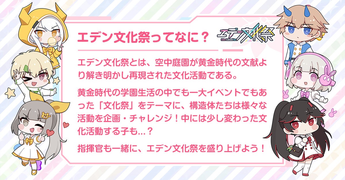 「エデン文化祭」とは、人類の文明が最高峰に達した黄金時代の文献に記載されていた「文化祭」を空中庭園が再現するお祭り型のイベントです。文化祭期間中は、ゲーム内外でさまざまなユーザー参加型イベントを開催予定です。