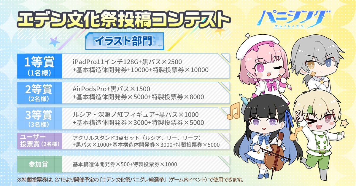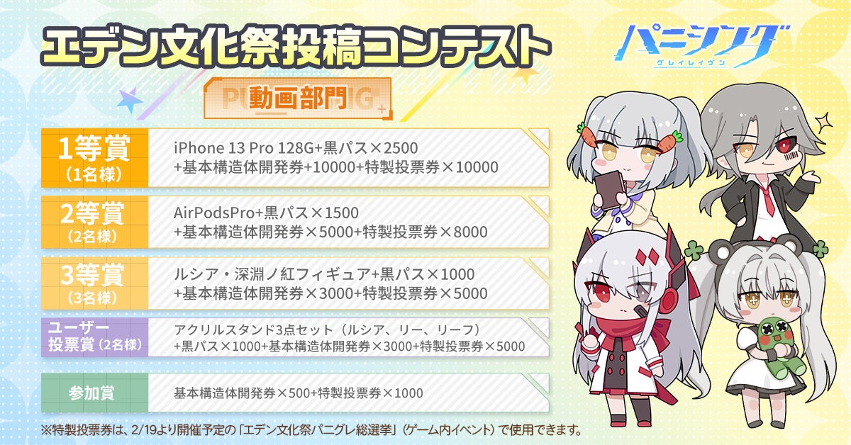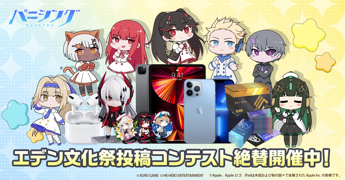 『パニシング:グレイレイヴン』は、「エデン文化祭」のイベントの一環である二次創作イベント「エデン文化祭 投稿コンテスト」を2022年1月20日(木)11:00より開催中です。本コンテストは「デザイン部門」と「動画部門」に分かれており、『パニシング:グレイレイヴン』運営チーム及びユーザー投票によって受賞作品を決定いたします。受賞作品にはiPhone 13 ProやiPad Pro、パニグレオリジナルグッズなどの豪華賞品が授与されます。応募要項などのコンテスト詳細は特設サイトをご覧ください。皆様のご参加をお待ちしております。
