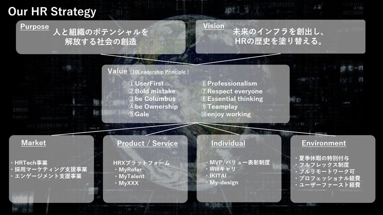 当社は、かねてよりValueとして10個のリーダーシッププリンシプルを掲げて組織運営をしています。今回のビジョン・パーパスのアップデートにより、より強固な企業文化や働く制度・環境を作り、HR市場にイノベーションを起こすプロ集団としての誇りを持ち、HRXプラットフォームを提供してまいります。