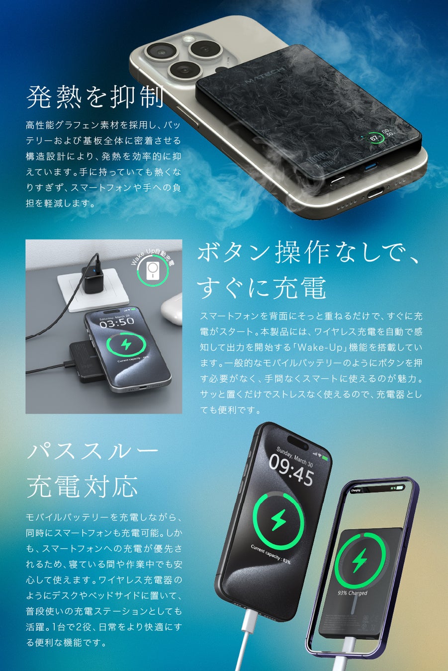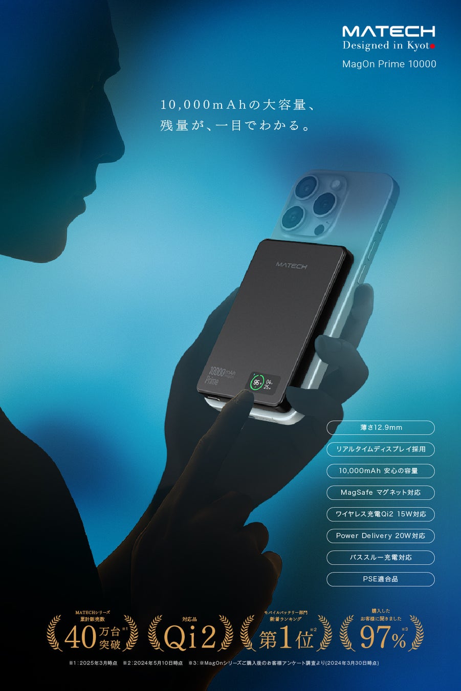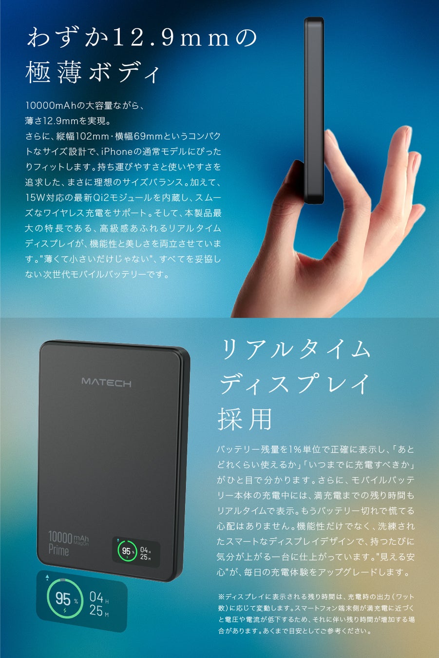 京都発のテックブランド「MATECH株式会社」(本社:京都府京都市下京区、代表取締役:松本 弘暉)は、極薄12.9mm設計&リアルタイムディスプレイ搭載のQi2モバイルバッテリー「MagOn Prime 10000(ブラック)」を新発売いたしました。